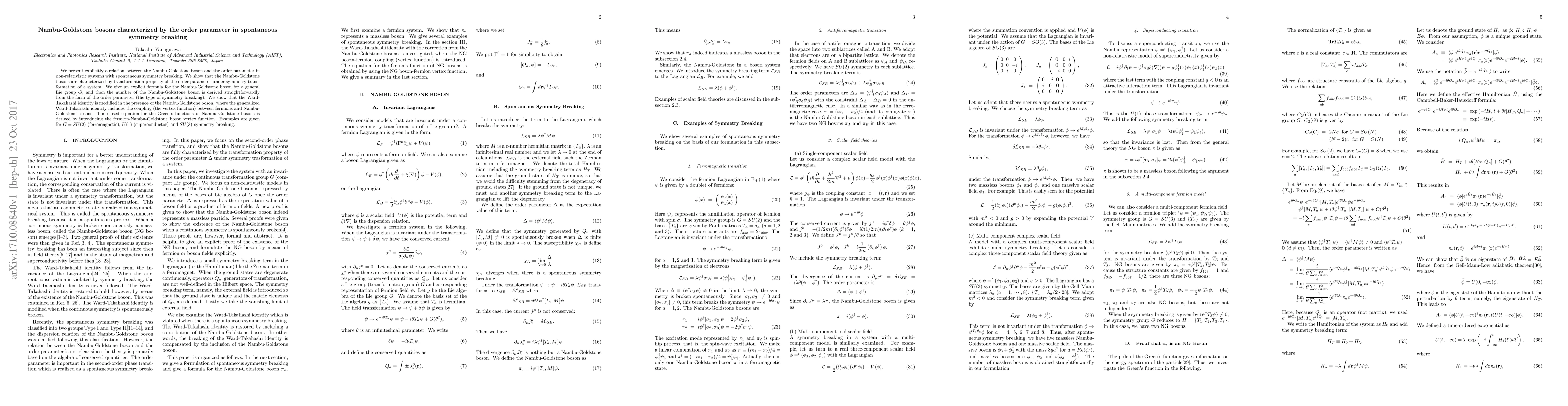 This paper establishes a clear connection between Nambu-Goldstone bosons and the order parameter in non-relativistic systems experiencing spontaneous symmetry breaking, providing an explicit formula for the bosons and deriving the number based on the symmetry of the order parameter. It also modifies the Ward-Takahashi identity to include the coupling between fermions and Nambu-Goldstone bosons, illustrated with examples for $SU(2)$, $U(1)$, and $SU(3)$ symmetry breaking.