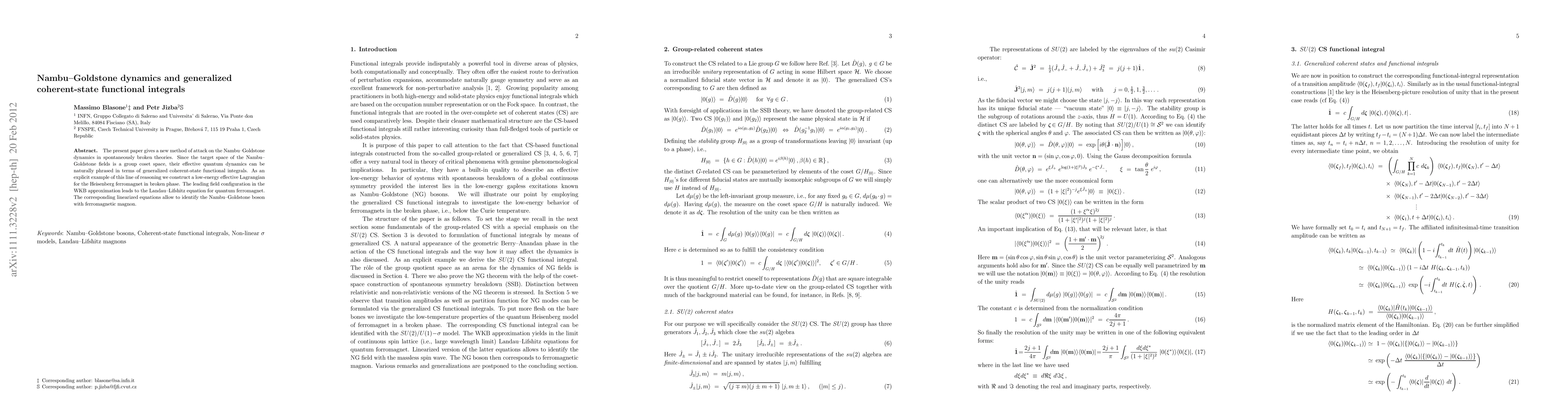 This paper introduces a novel method for studying Nambu-Goldstone dynamics in spontaneously broken theories using generalized coherent-state functional integrals. It constructs a low-energy effective Lagrangian for the Heisenberg ferromagnet, identifying the Nambu-Goldstone boson as a ferromagnetic magnon.