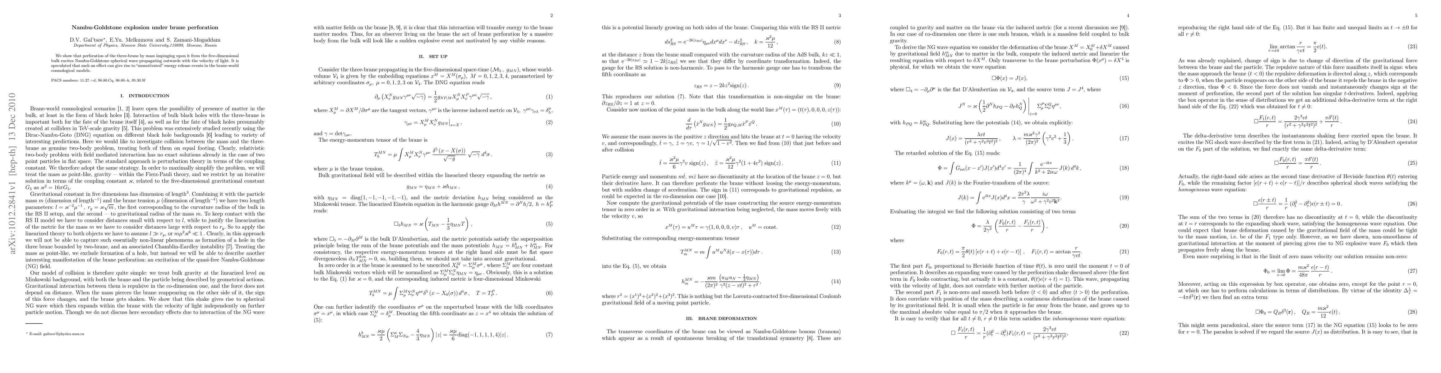 We show that perforation of the three-brane by mass impinging upon it from the five-dimensional bulk excites Nambu-Goldstone spherical wave propagating outwards with the velocity of light. It is speculated that such an effect can give rise to "`unmotivated" energy release events in the brane-world cosmological models.
