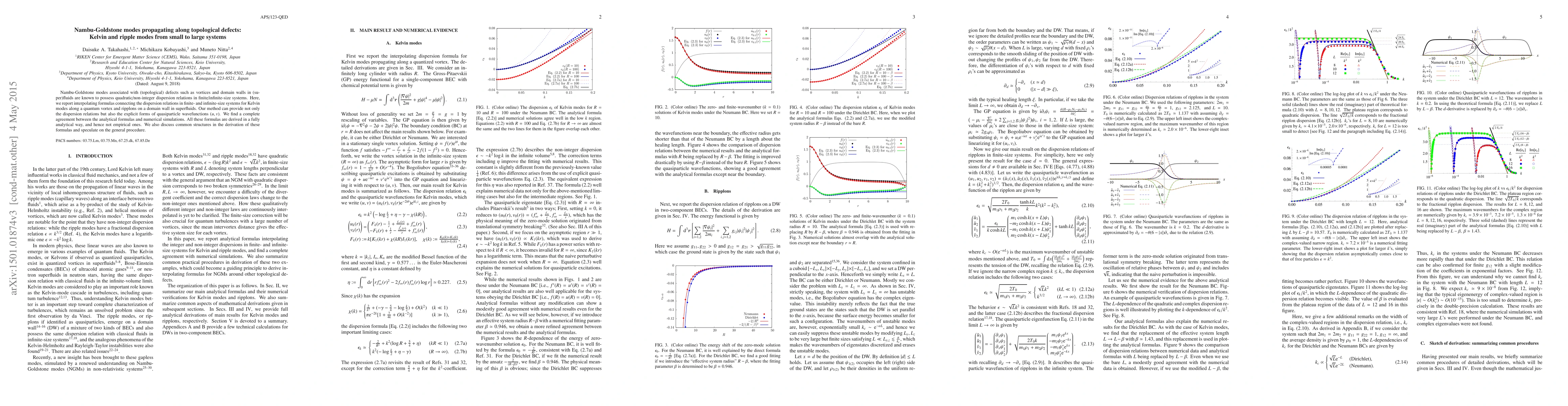 Nambu-Goldstone modes associated with (topological) defects such as vortices and domain walls in (super)fluids are known to possess quadratic/non-integer dispersion relations in finite/infinite-size systems. Here, we report interpolating formulas connecting the dispersion relations in finite- and infinite-size systems for Kelvin modes along a quantum vortex and ripplons on a domain wall in superfluids. Our method can provide not only the dispersion relations but also the explicit forms of quasiparticle wavefunctions $(u,v)$. We find a complete agreement between the analytical formulas and numerical simulations. All these formulas are derived in a fully analytical way, and hence not empirical ones. We also discuss common structures in the derivation of these formulas and speculate on the general procedure.
