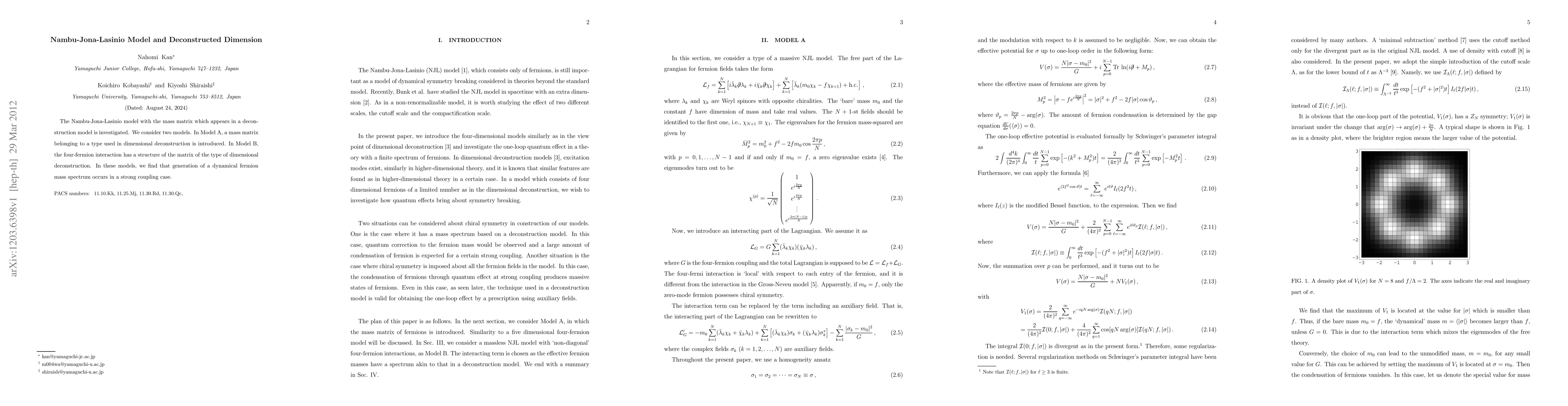 The Nambu-Jona-Lasinio model with the mass matrix which appears in a deconstruction model is investigated. We consider two models. In Model A, a mass matrix belonging to a type used in dimensional deconstruction is introduced. In Model B, the four-fermion interaction has a structure of the matrix of the type of dimensional deconstruction. In these models, we find that generation of a dynamical fermion mass spectrum occurs in a strong coupling case.