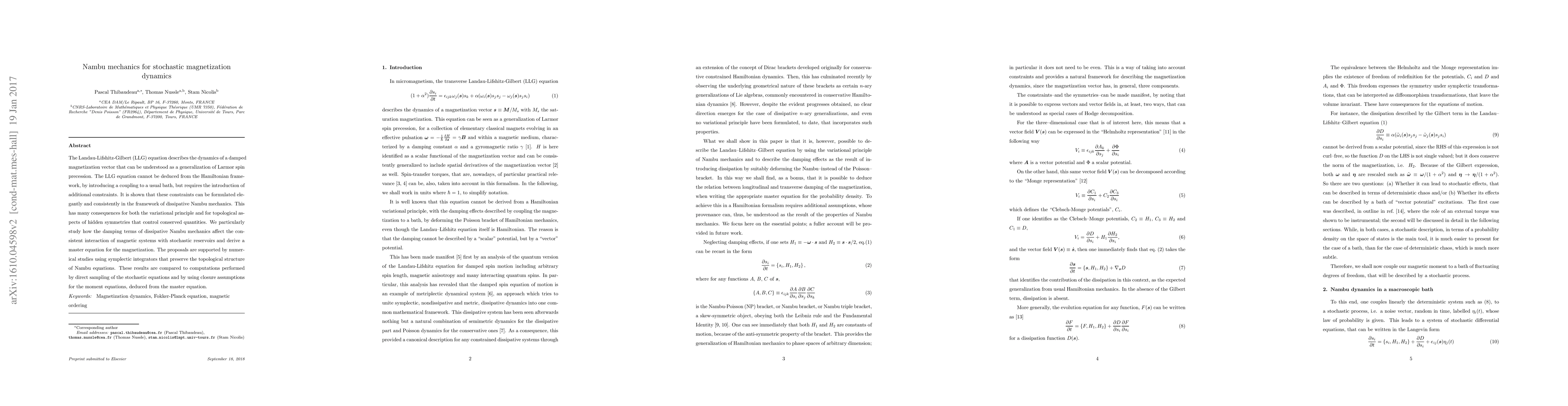The Landau-Lifshitz-Gilbert (LLG) equation describes the dynamics of a damped magnetization vector that can be understood as a generalization of Larmor spin precession. The LLG equation cannot be deduced from the Hamiltonian framework, by introducing a coupling to a usual bath, but requires the introduction of additional constraints. It is shown that these constraints can be formulated elegantly and consistently in the framework of dissipative Nambu mechanics. This has many consequences for both the variational principle and for topological aspects of hidden symmetries that control conserved quantities. We particularly study how the damping terms of dissipative Nambu mechanics affect the consistent interaction of magnetic systems with stochastic reservoirs and derive a master equation for the magnetization. The proposals are supported by numerical studies using symplectic integrators that preserve the topological structure of Nambu equations. These results are compared to computations performed by direct sampling of the stochastic equations and by using closure assumptions for the moment equations, deduced from the master equation.
