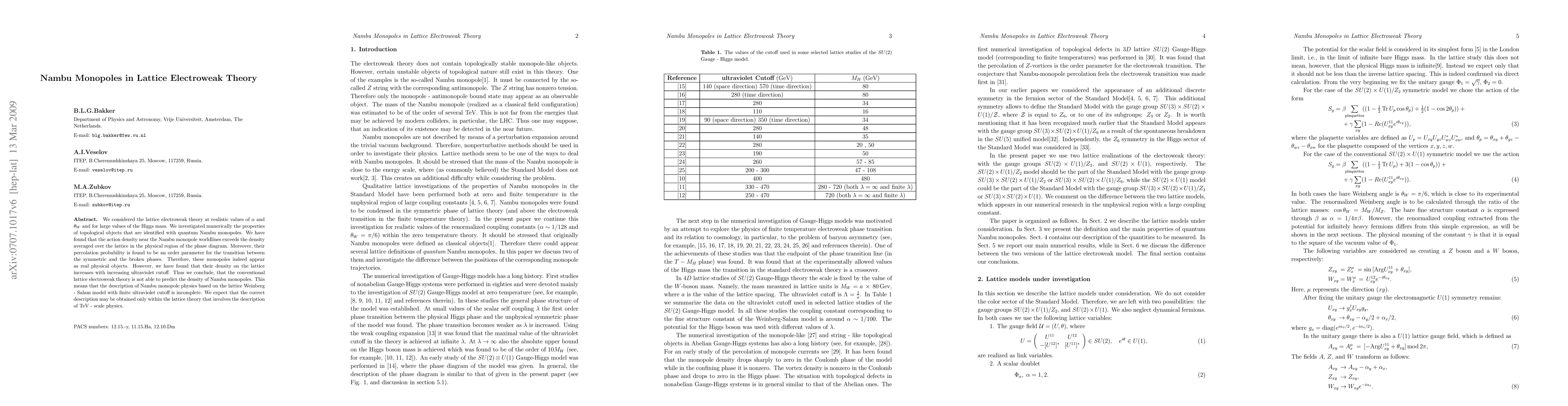 We considered the lattice electroweak theory at realistic values of $\alpha$ and $\theta_W$ and for large values of the Higgs mass. We investigated numerically the properties of topological objects that are identified with quantum Nambu monopoles. We have found that the action density near the Nambu monopole worldlines exceeds the density averaged over the lattice in the physical region of the phase diagram. Moreover, their percolation probability is found to be an order parameter for the transition between the symmetric and the broken phases. Therefore, these monopoles indeed appear as real physical objects. However, we have found that their density on the lattice increases with increasing ultraviolet cutoff. Thus we conclude, that the conventional lattice electroweak theory is not able to predict the density of Nambu monopoles. This means that the description of Nambu monopole physics based on the lattice Weinberg - Salam model with finite ultraviolet cutoff is incomplete. We expect that the correct description may be obtained only within the lattice theory that involves the description of TeV - scale physics.