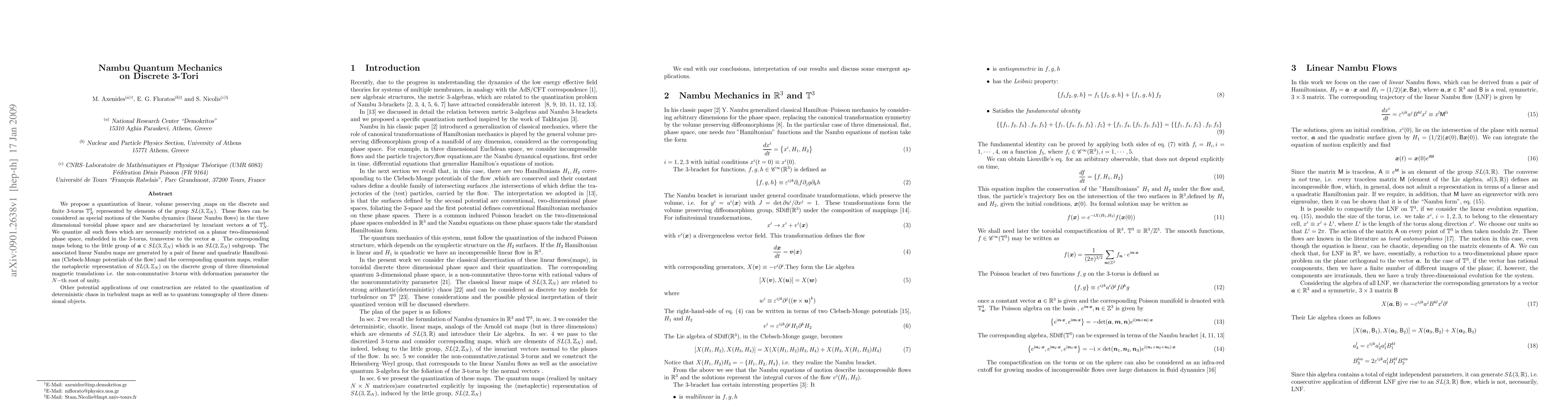 We propose a quantization of linear, volume preserving, maps on the discrete and finite 3-torus T_N^3 represented by elements of the group SL(3,Z_N). These flows can be considered as special motions of the Nambu dynamics (linear Nambu flows) in the three dimensional toroidal phase space and are characterized by invariant vectors, a, of T_N^3. We quantize all such flows which are necessarily restricted on a planar two-dimensional phase space, embedded in the 3-torus, transverse to the vector a . The corresponding maps belong to the little group of the vector a in SL(3,Z_N) which is an SL(2,Z_N) subgroup. The associated linear Nambu maps are generated by a pair of linear and quadratic Hamiltonians (Clebsch-Monge potentials of the flow) and the corresponding quantum maps, realize the metaplectic representation of SL(3,Z_N) on the discrete group of three dimensional magnetic translations i.e. the non-commutative 3-torus with deformation parameter the N-th root of unity. Other potential applications of our construction are related to the quantization of deterministic chaos in turbulent maps as well as to quantum tomography of three dimensional objects.