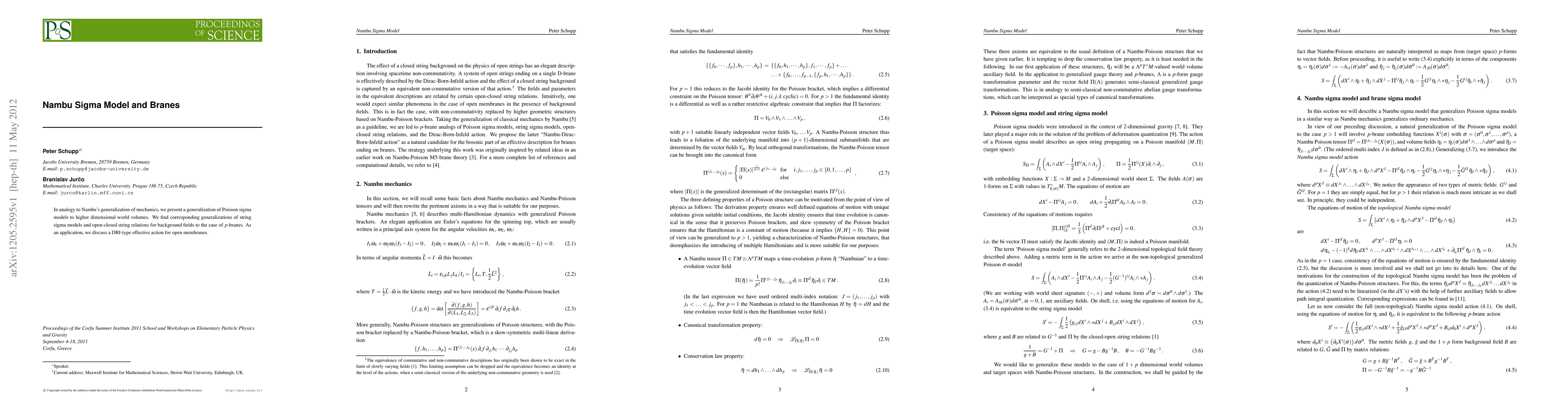In analogy to Nambu's generalization of mechanics, we present a generalization of Poisson sigma models to higher dimensional world volumes. We find corresponding generalizations of string sigma models and open-closed string relations for background fields to the case of p-branes. As an application, we discuss a DBI-type effective action for open membranes.