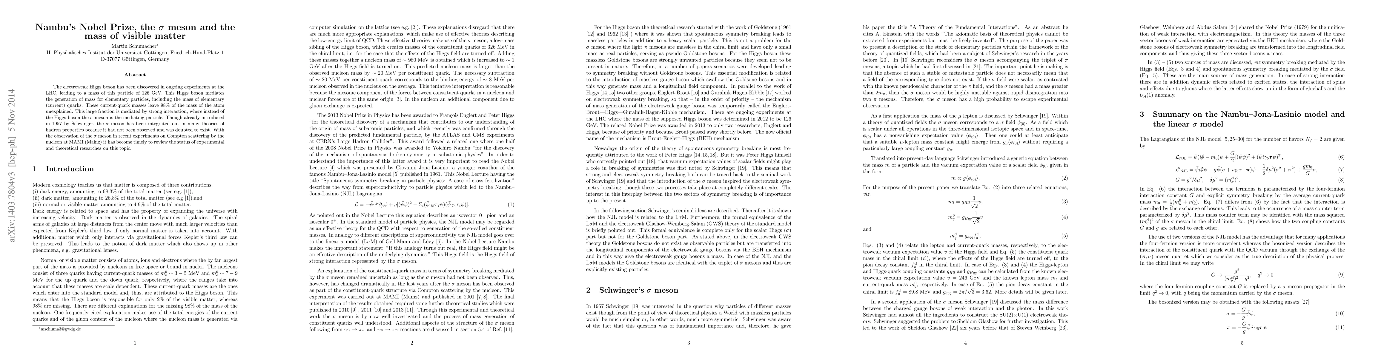 The electroweak Higgs boson has been discovered in ongoing experiments at the LHC, leading to a mass of this particle of 126 GeV. This Higgs boson mediates the generation of mass for elementary particles, including the mass of elementary (current) quarks. These current-quark masses leave 98% of the mass of the atom unexplained. This large fraction is mediated by strong interaction, where instead of the Higgs boson the $\sigma$ meson is the mediating particle. Though already discovered in 1957 by Schwinger, the $\sigma$ meson has been integrated out in many theories of hadron properties because it had not been observed and was doubted to exist. With the observation of the $\sigma$ meson in recent experiments on Compton scattering by the nucleon at MAMI (Mainz) it has become timely to review the status of experimental and theoretical researches on this topic.