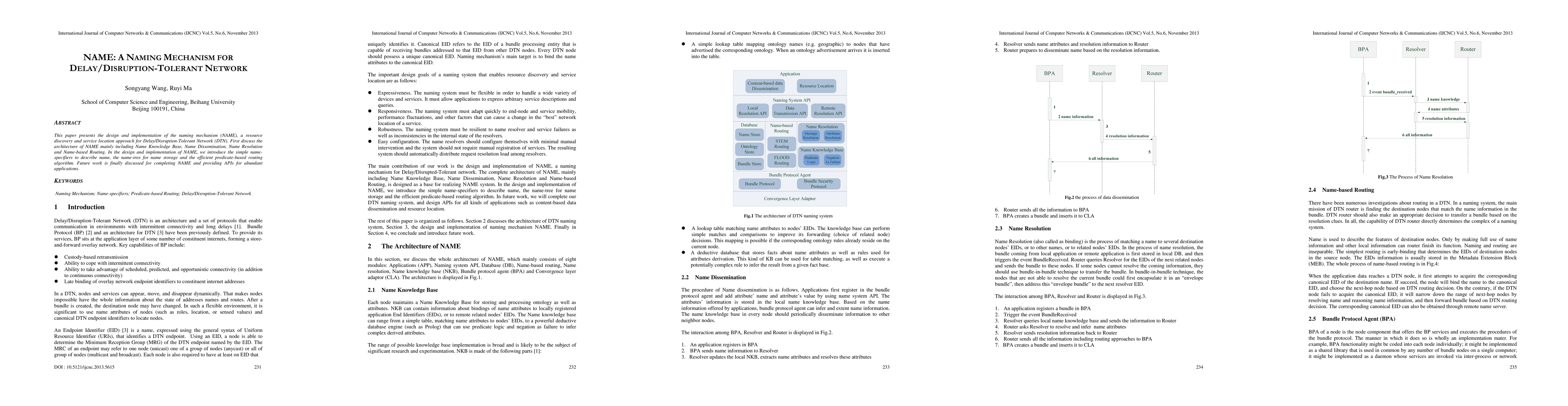 This paper introduces NAME, a naming mechanism for Delay/Disruption-Tolerant Networks, featuring a Name Knowledge Base, Name Dissemination, Name Resolution, and Name-based Routing. It employs simple name specifiers, a name-tree for storage, and a predicate-based routing algorithm.
