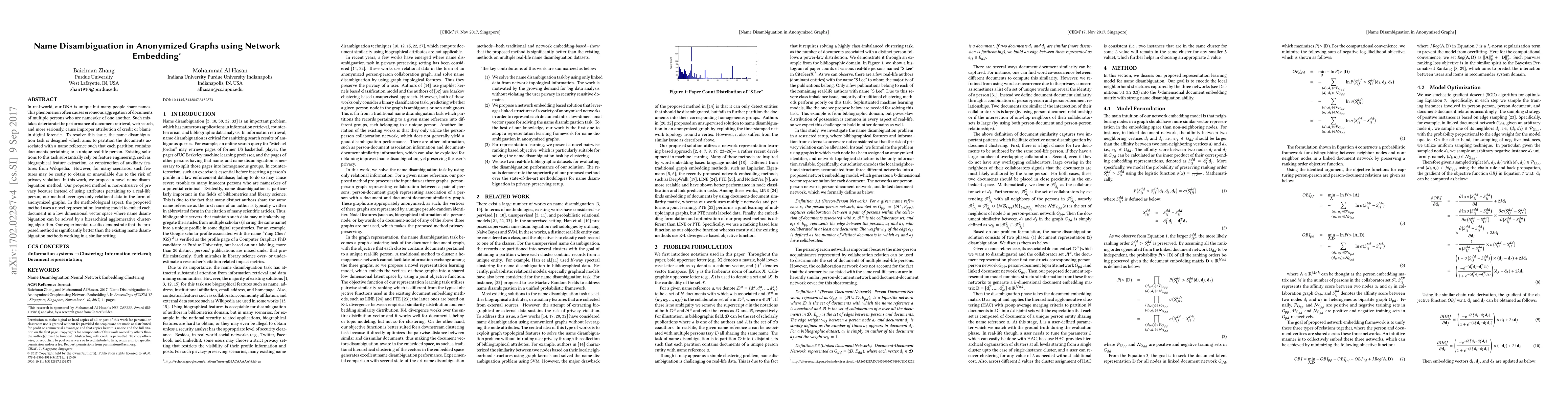 This paper proposes a novel name disambiguation method using network embedding on anonymized graphs, avoiding reliance on personal attributes to maintain privacy. The method embeds documents into a low-dimensional vector space, enabling effective disambiguation via hierarchical clustering, outperforming existing feature-based methods.