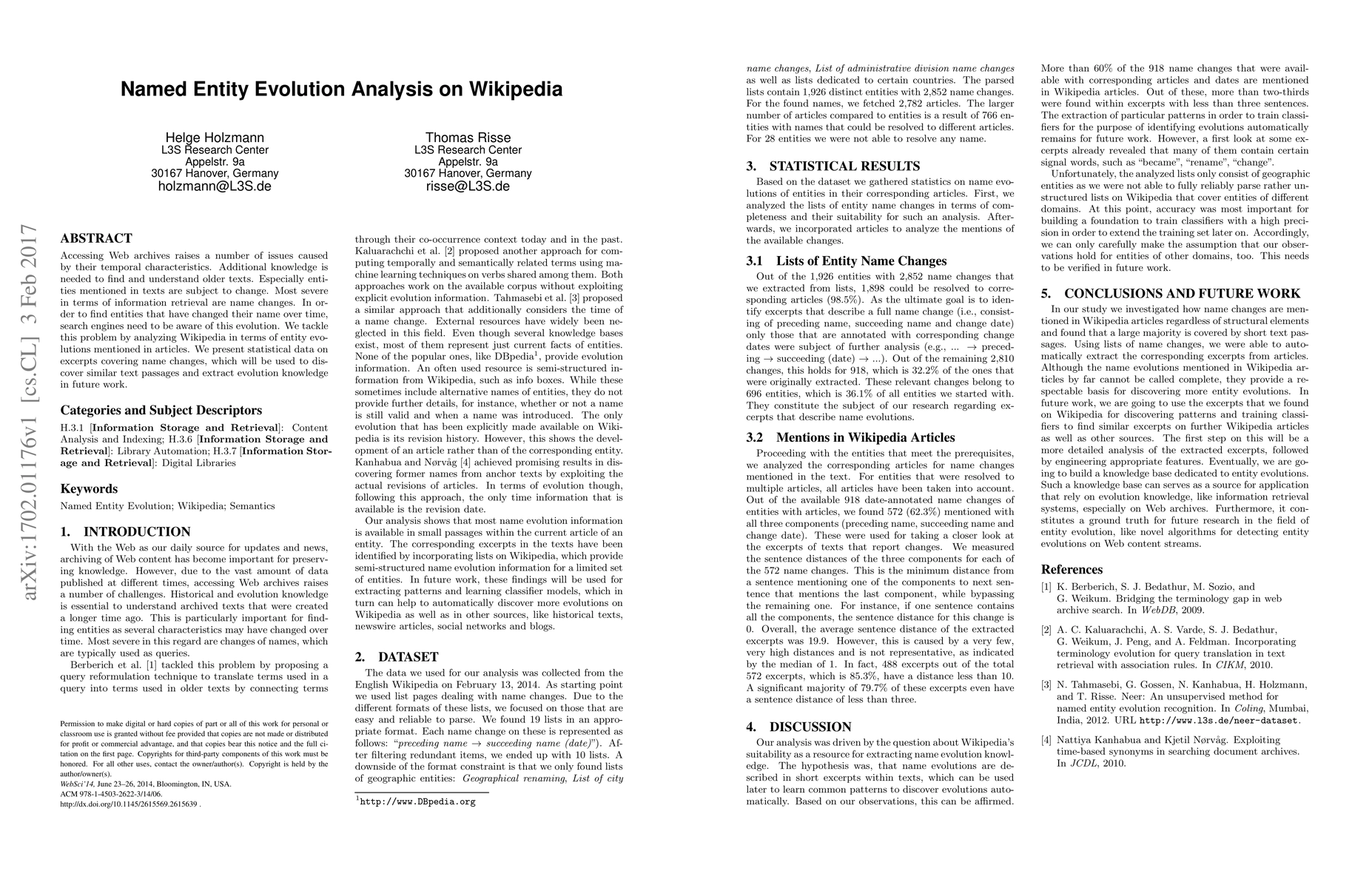 This paper analyzes the evolution of named entities in Wikipedia to address challenges in information retrieval caused by name changes over time. It presents statistical data on entity name changes to facilitate future discovery of similar text passages and extraction of evolution knowledge.