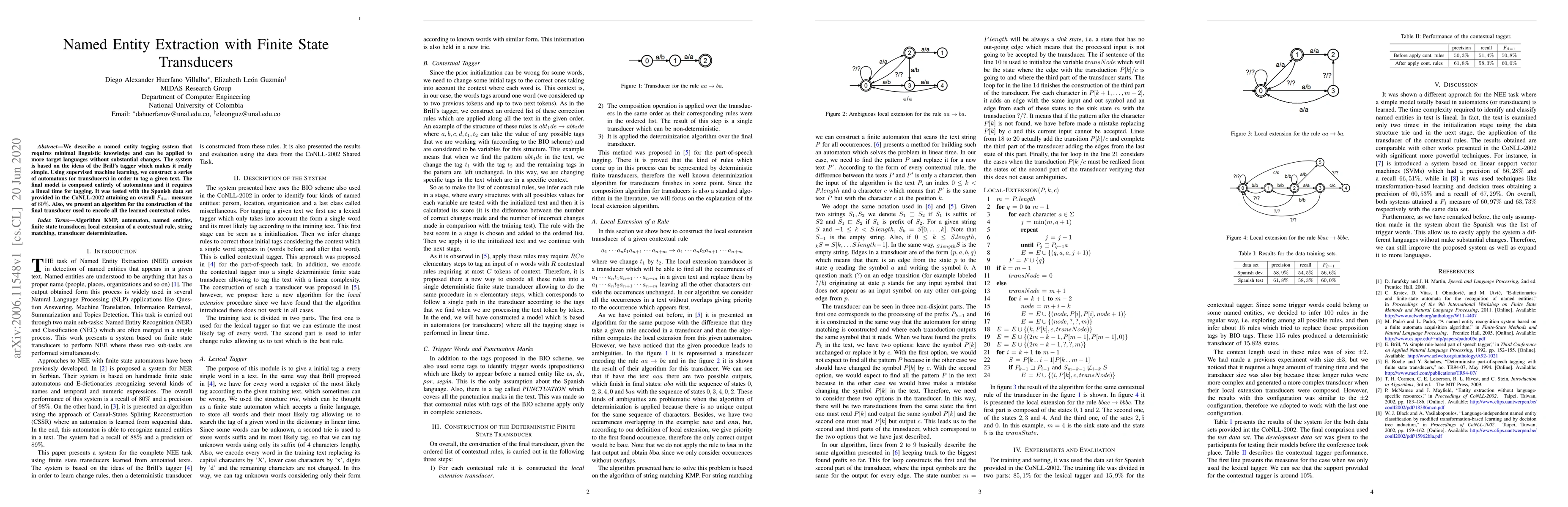 This paper introduces a named entity extraction system that uses finite state transducers to tag entities in text with minimal linguistic knowledge. It achieved an overall F-score of 60% on the Spanish dataset, showcasing its potential for applying to target languages without substantial changes.
