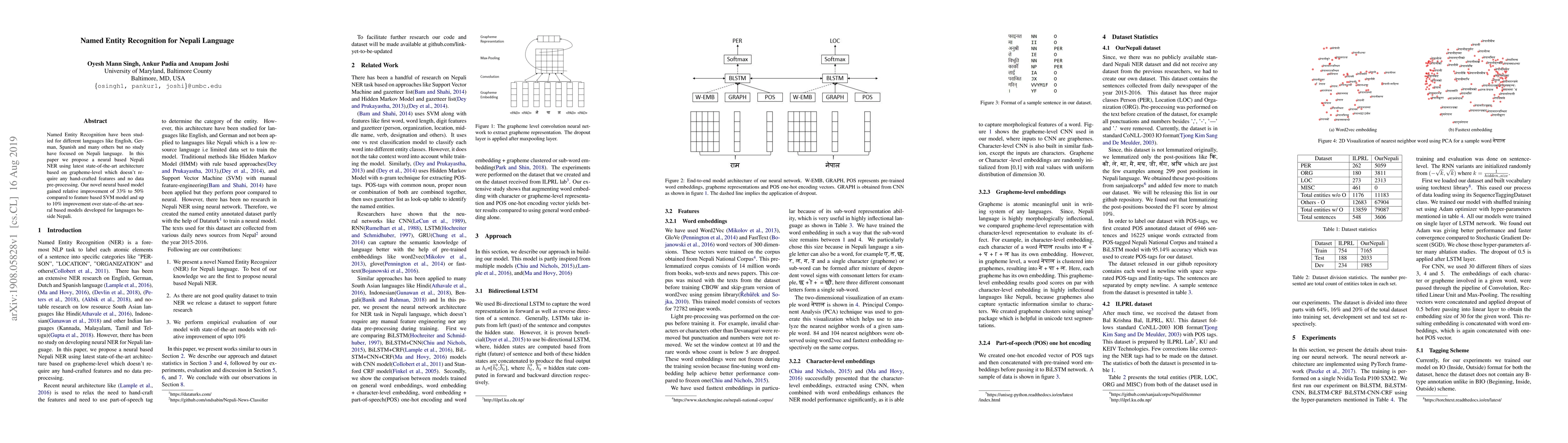 This paper introduces a neural-based Named Entity Recognition (NER) model for the Nepali language, utilizing a state-of-the-art grapheme-level architecture without hand-crafted features or data pre-processing. The proposed model achieves a relative improvement of 33% to 50% over a feature-based SVM model and up to 10% over existing neural models for other languages.