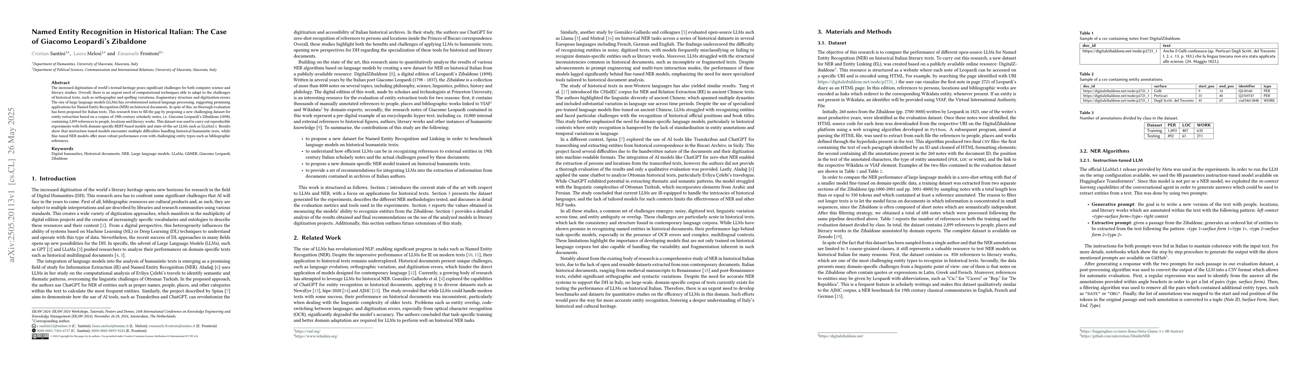 The research proposes a new dataset based on Giacomo Leopardi's Zibaldone, a 19th-century corpus with 2,899 references to people, locations, and literary works. It evaluates both BERT-based models and state-of-the-art LLMs like LLaMa3.1 for Named Entity Recognition (NER) on historical texts.