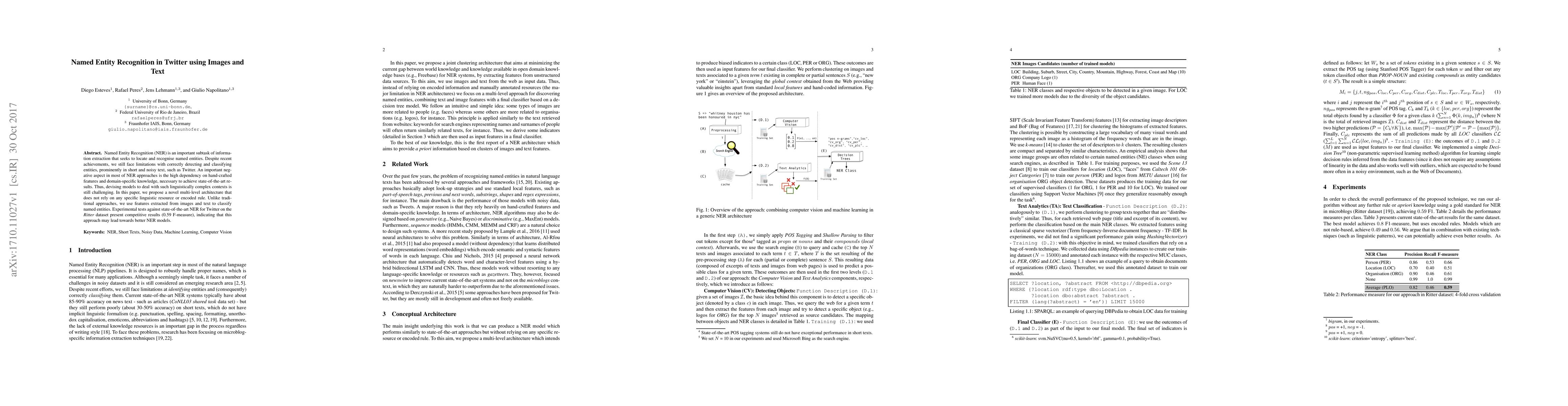 This paper proposes a novel multi-level architecture for Named Entity Recognition (NER) in Twitter that leverages features from both images and text, avoiding traditional reliance on hand-crafted features. Experimental results show competitive performance, suggesting potential for improved NER models in noisy, short-form text contexts.