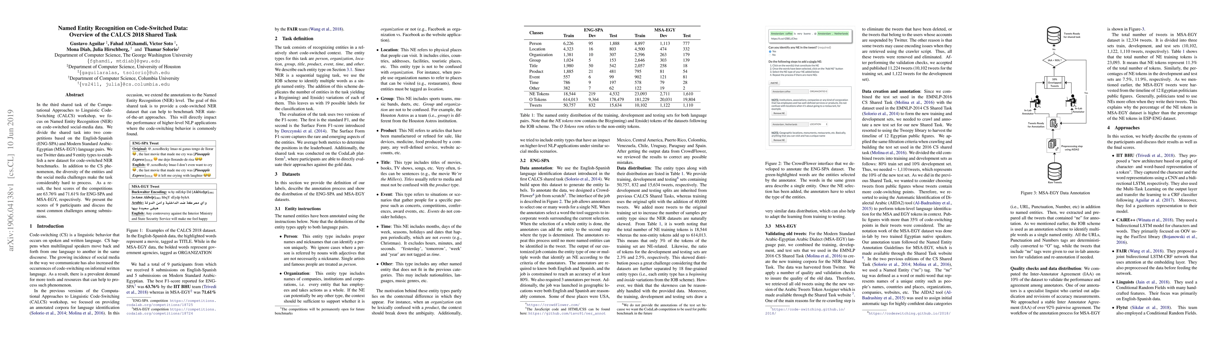 This paper summarizes the CALCS 2018 shared task on Named Entity Recognition (NER) for code-switched social media data, focusing on English-Spanish and Modern Standard Arabic-Egyptian language pairs. The best scores achieved were 63.76% and 71.61%, respectively, highlighting the challenges posed by code-switching and social media data.