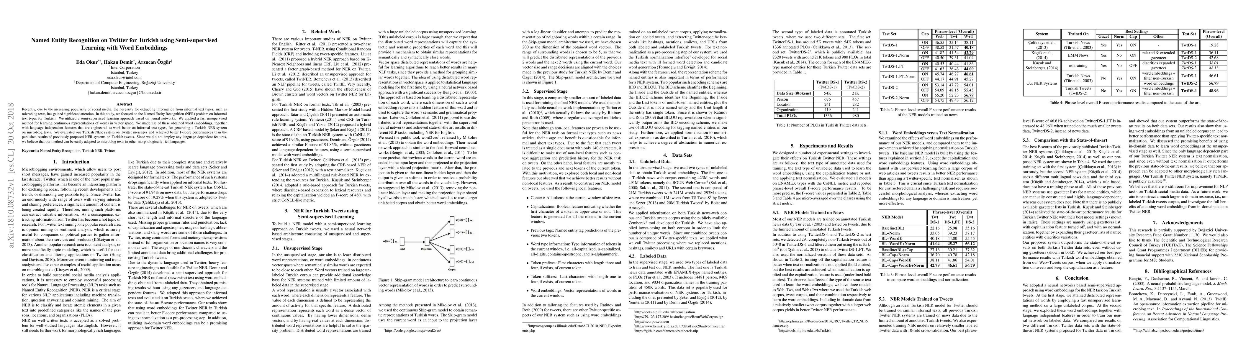This study develops a semi-supervised learning approach for Named Entity Recognition (NER) on Turkish microblog texts using word embeddings and language-independent features. The proposed system outperforms existing NER systems for Turkish tweets and can potentially be adapted to other morphologically rich languages.