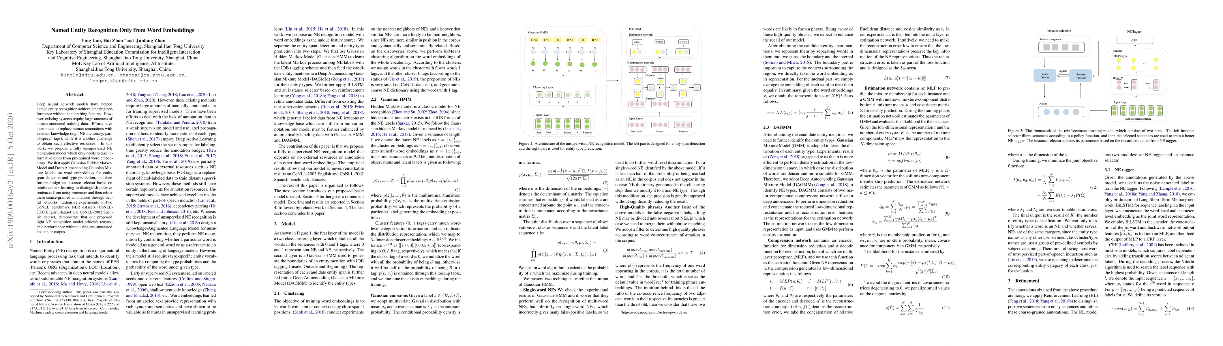 This paper proposes an unsupervised named entity recognition model that relies solely on pre-trained word embeddings, eliminating the need for human-annotated data or external resources. The model uses a combination of Gaussian Hidden Markov Models and Deep Autoencoding Gaussian Mixture Models for entity detection and reinforcement learning for instance selection and refinement.