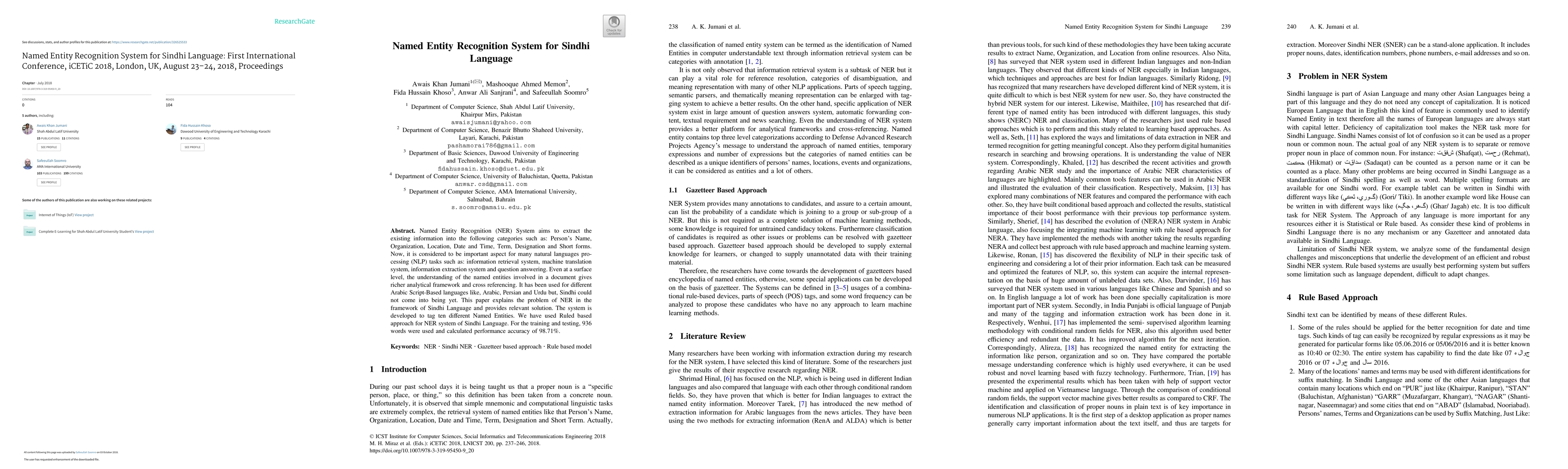 This paper develops a Named Entity Recognition (NER) system for Sindhi language, tagging ten categories including Persons Name, Organization, and Location. Utilizing a rule-based approach, the system achieved a performance accuracy of 98.71% on a dataset of 936 words, addressing the lack of NER solutions for Sindhi.
