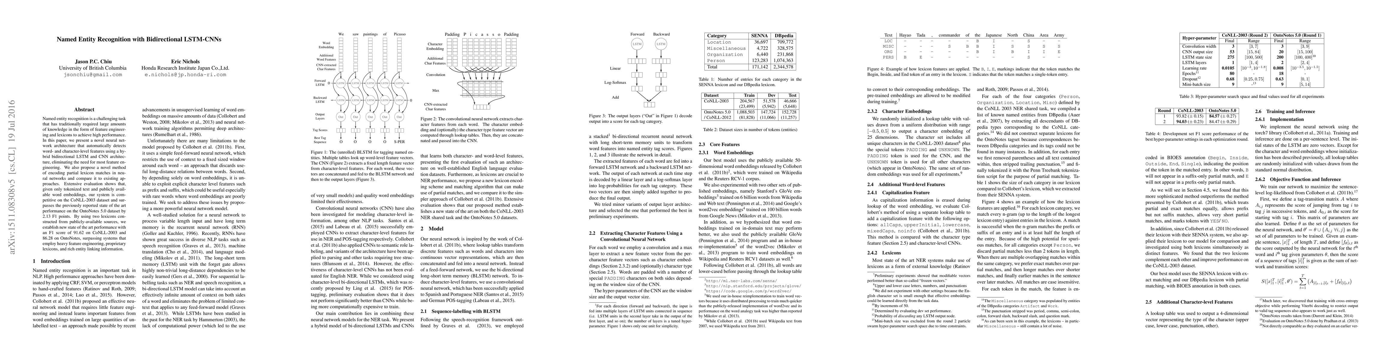 The paper introduces a hybrid bidirectional LSTM-CNN architecture for NER and a novel method for encoding partial lexicon matches, demonstrating improved performance over traditional approaches.