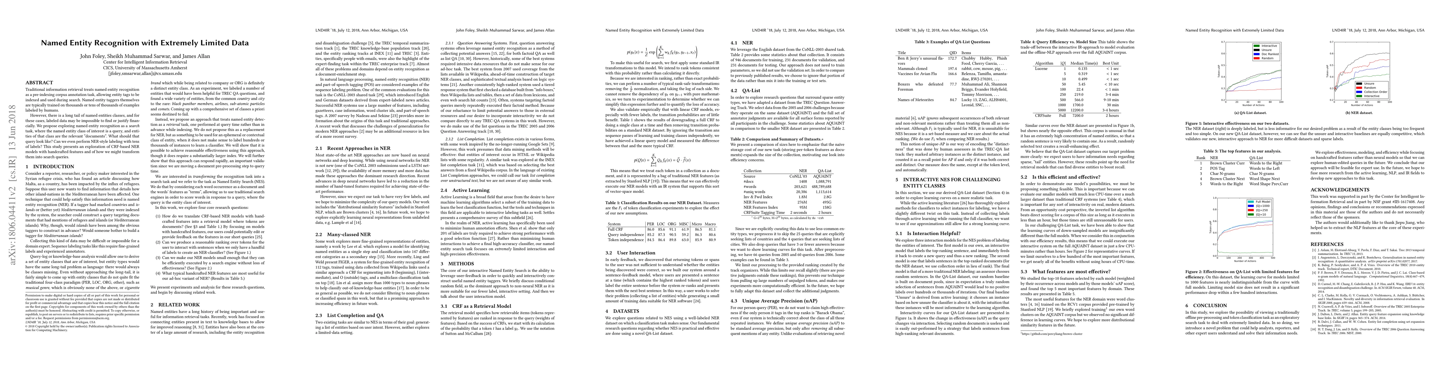This paper investigates named entity recognition (NER) with minimal labeled data, proposing to view NER as a search task rather than a pre-indexing annotation. It explores CRF-based NER models using handcrafted features and examines their potential for transforming into effective search queries.