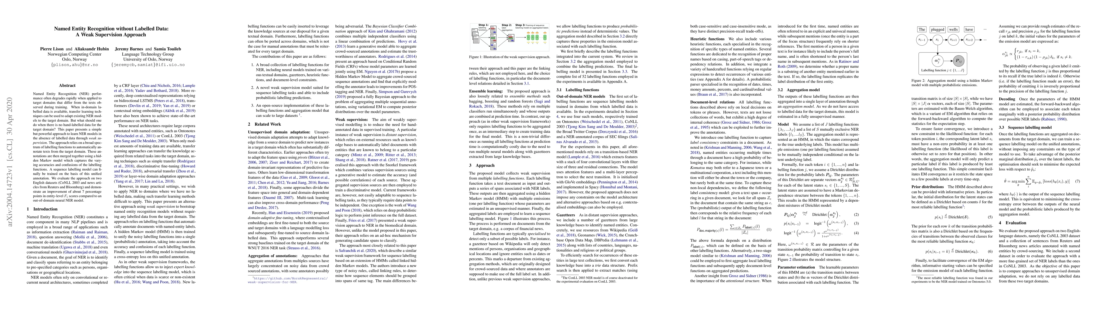 This paper proposes a method for Named Entity Recognition (NER) without labelled data using weak supervision, employing a variety of labelling functions to automatically annotate target domain texts. The annotations are merged via a hidden Markov model, enabling the training of a sequence labelling model, which shows a 7% improvement in $F_1$ scores compared to an out-of-domain neural NER model.