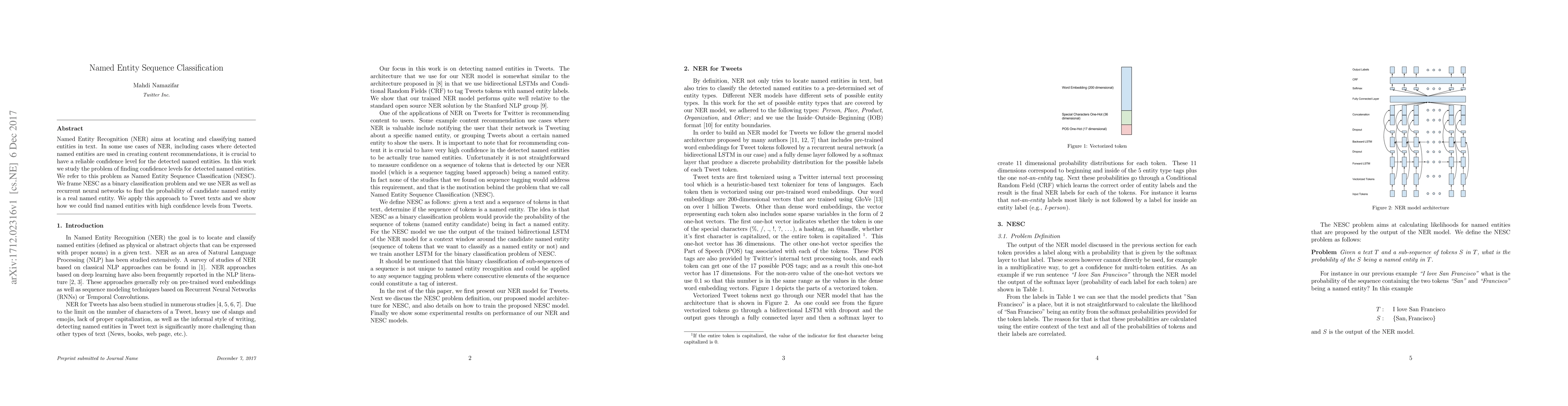 This paper explores Named Entity Sequence Classification (NESC) to determine the confidence level of detected named entities, framing it as a binary classification problem. It employs Named Entity Recognition (NER) and recurrent neural networks to identify high-confidence named entities in Tweets.