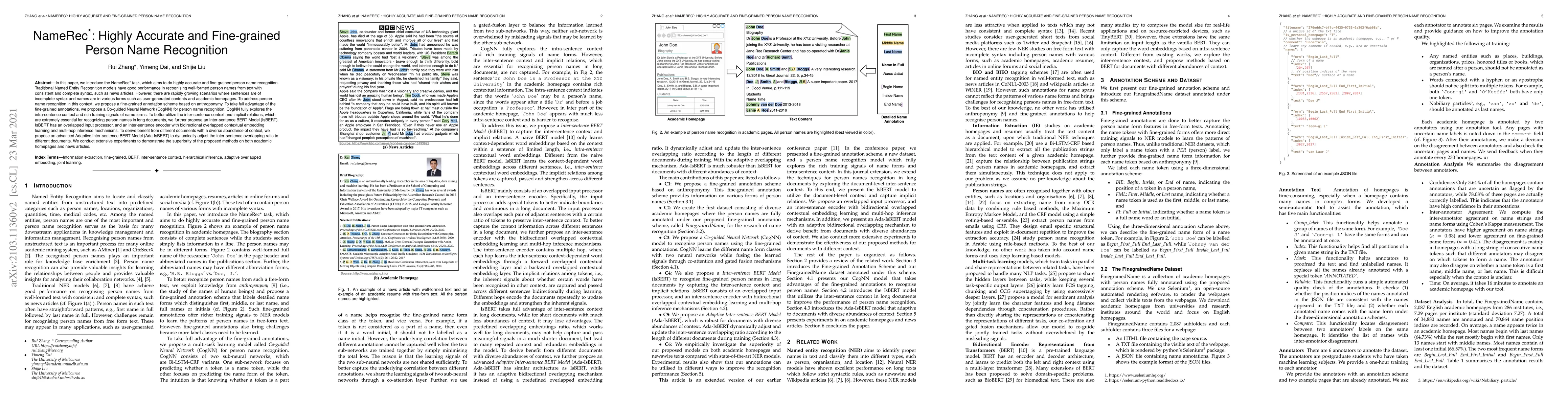 In this paper, we introduce the NameRec* task, which aims to do highly accurate and fine-grained person name recognition. Traditional Named Entity Recognition models have good performance in recognising well-formed person names from text with consistent and complete syntax, such as news articles. However, there are rapidly growing scenarios where sentences are of incomplete syntax and names are in various forms such as user-generated contents and academic homepages. To address person name recognition in this context, we propose a fine-grained annotation scheme based on anthroponymy. To take full advantage of the fine-grained annotations, we propose a Co-guided Neural Network (CogNN) for person name recognition. CogNN fully explores the intra-sentence context and rich training signals of name forms. To better utilize the inter-sentence context and implicit relations, which are extremely essential for recognizing person names in long documents, we further propose an Inter-sentence BERT Model (IsBERT). IsBERT has an overlapped input processor, and an inter-sentence encoder with bidirectional overlapped contextual embedding learning and multi-hop inference mechanisms. To derive benefit from different documents with a diverse abundance of context, we propose an advanced Adaptive Inter-sentence BERT Model (Ada-IsBERT) to dynamically adjust the inter-sentence overlapping ratio to different documents. We conduct extensive experiments to demonstrate the superiority of the proposed methods on both academic homepages and news articles.