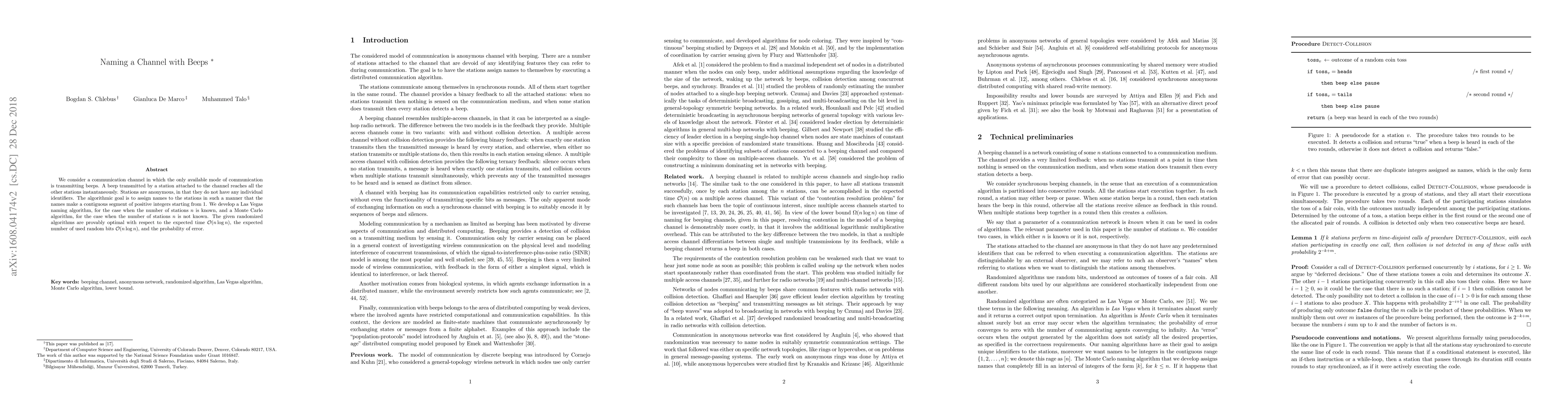 We consider a communication channel in which the only possible communication mode is transmitting beeps, which reach all the nodes instantaneously. Nodes are anonymous, in that they do not have any individual identifiers. The algorithmic goal is to randomly assign names to the nodes in such a manner that the names make a contiguous segment of positive integers starting from $1$. We give a Las Vegas naming algorithm for the case when the number of nodes $n$ is known, and a Monte Carlo algorithm for the case when the number of nodes $n$ is not known. The algorithms are provably optimal with respect to the expected time $O(n\log n)$, the number of used random bits $O(n\log n)$, and the probability of error.
