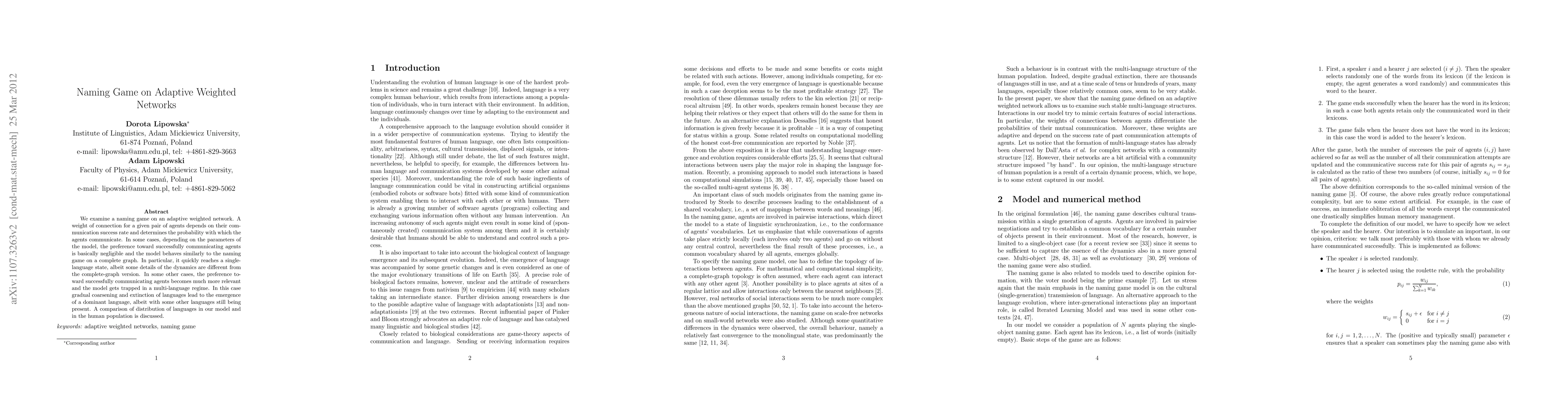 This paper investigates a naming game on adaptive weighted networks where connection weights depend on communication success rates. The model can transition to a single-language state or remain in a multi-language regime, with gradual language extinction leading to a dominant language, mirroring some aspects of human linguistic dynamics.