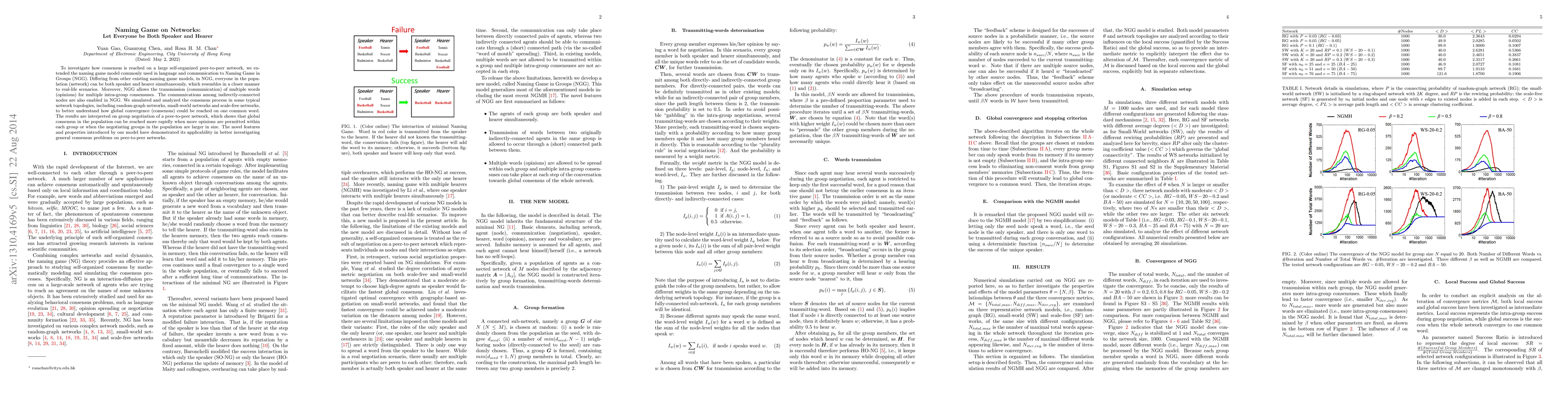 To investigate how consensus is reached on a large self-organized peer-to-peer network, we extended the naming game model commonly used in language and communication to Naming Game in Groups (NGG). Differing from other existing naming game models, in NGG, everyone in the population (network) can be both speaker and hearer simultaneously, which resembles in a closer manner to real-life scenarios. Moreover, NGG allows the transmission (communication) of multiple words (opinions) for multiple intra-group consensuses. The communications among indirectly-connected nodes are also enabled in NGG. We simulated and analyzed the consensus process in some typical network topologies, including random-graph networks, small-world networks and scale-free networks, to better understand how global convergence (consensus) could be reached on one common word. The results are interpreted on group negotiation of a peer-to-peer network, which shows that global consensus in the population can be reached more rapidly when more opinions are permitted within each group or when the negotiating groups in the population are larger in size. The novel features and properties introduced by our model have demonstrated its applicability in better investigating general consensus problems on peer-to-peer networks.