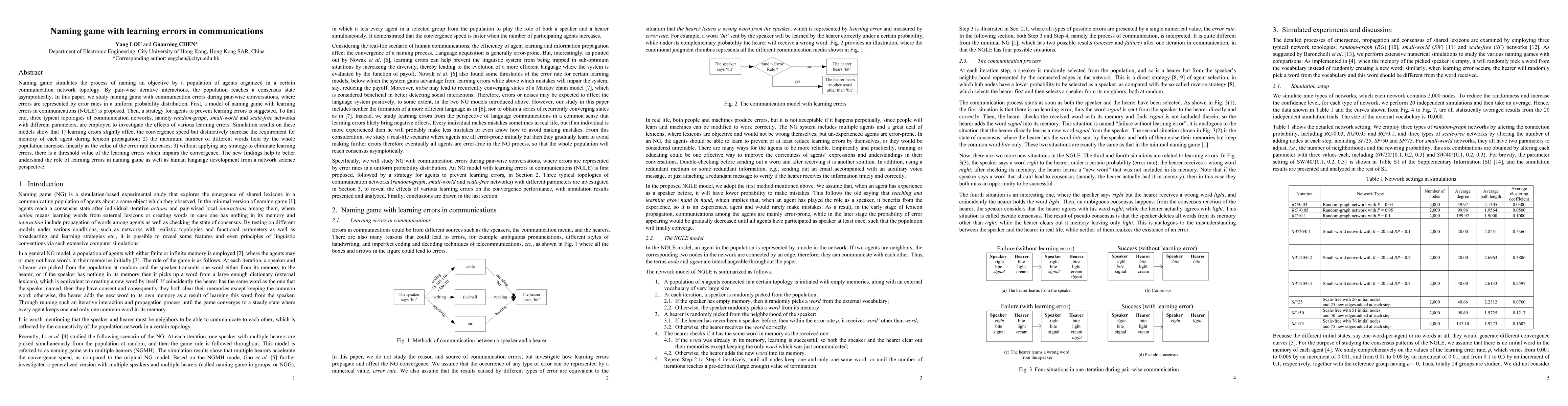 This paper proposes a model for a naming game with learning errors in communications (NGLE) and investigates how these errors affect consensus and lexicon propagation in various network topologies. Findings show that while learning errors slightly slow convergence, they significantly increase memory requirements and the diversity of words held by the population, with a critical threshold beyond which convergence is impaired.