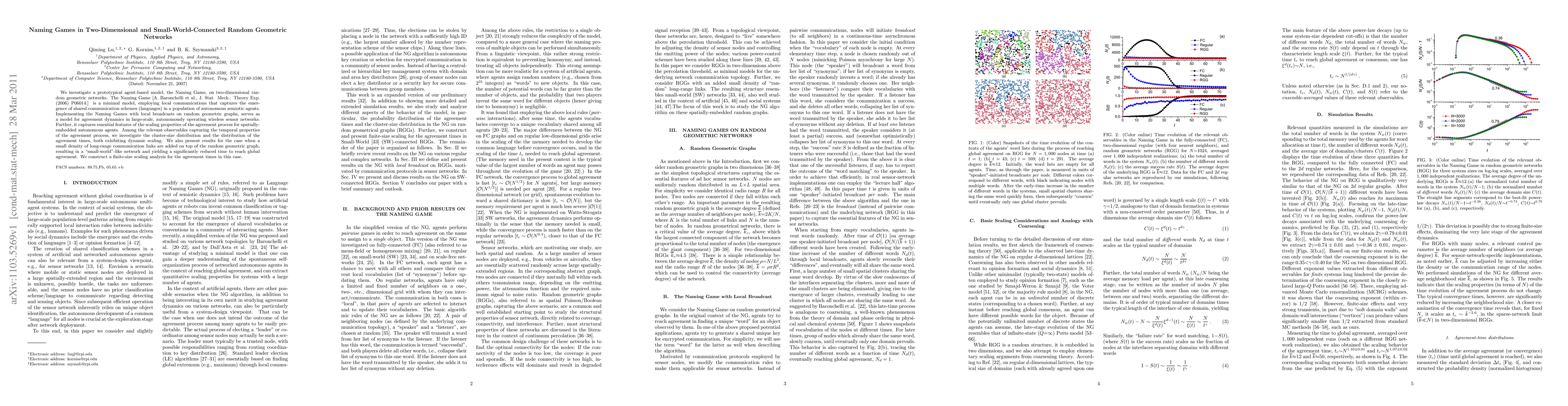 This paper explores the Naming Game model on two-dimensional random geometric networks to understand the emergence of shared communication schemes. It examines the dynamics of agreement in wireless sensor networks and finds that adding long-range links to form small-world networks significantly reduces the time to global agreement.