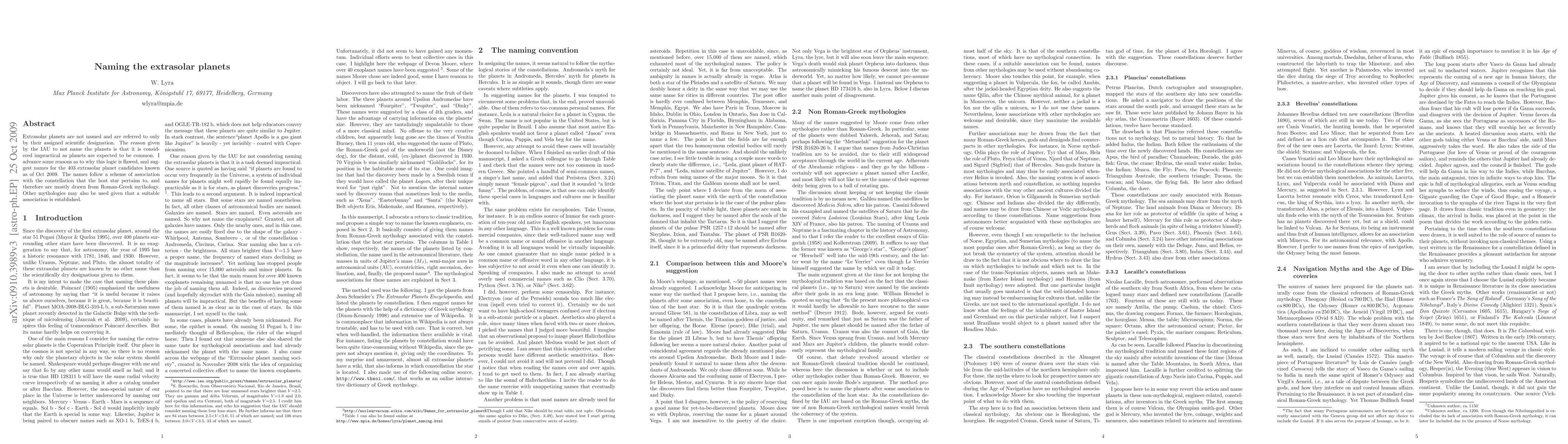 The paper argues against the impracticality of naming extrasolar planets and proposes a naming scheme based on the constellations of their host stars, primarily using Roman-Greek mythology, to name the 403 known extrasolar planet candidates as of October 2009.