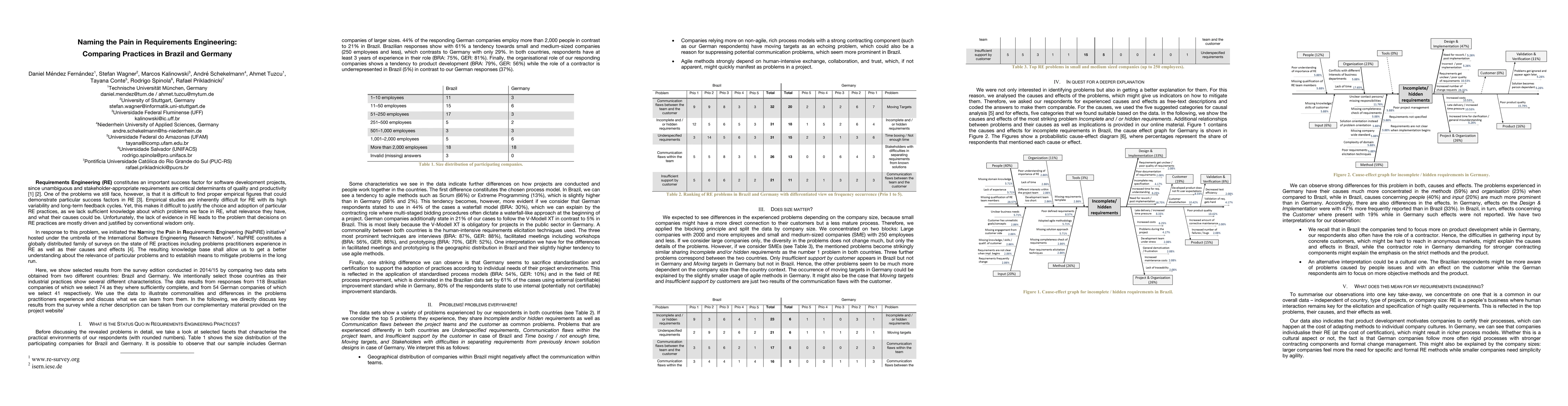 As part of the Naming the Pain in Requirements Engineering (NaPiRE) initiative, researchers compared problems that companies in Brazil and Germany encountered during requirements engineering (RE). The key takeaway was that in RE, human interaction is necessary for eliciting and specifying high-quality requirements, regardless of country, project type, or company size.