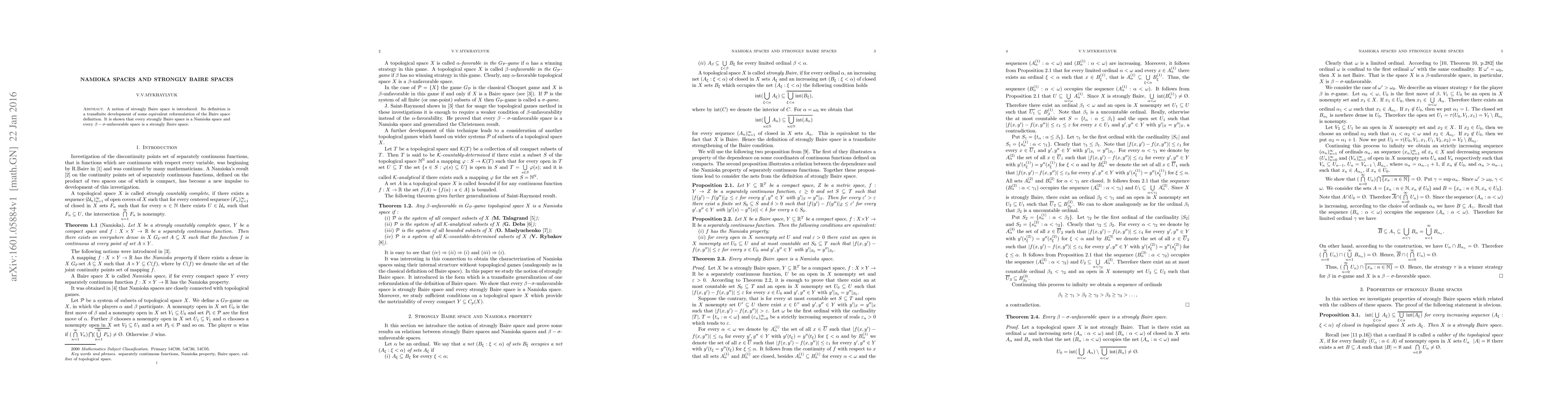 Summary: This paper introduces strongly Baire spaces, a transfinite extension of the Baire space definition, and demonstrates that every strongly Baire space is a Namioka space. Additionally, it proves that $\beta-\sigma$-unfavorable spaces fall under the category of strongly Baire spaces.
