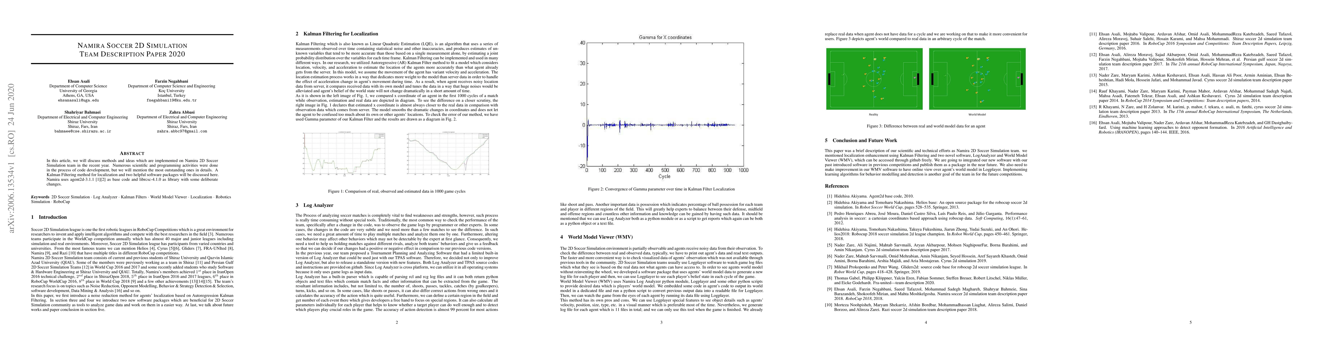 This paper details the development and implementation of a 2D soccer simulation by the Namira team, focusing on notable scientific and programming activities. Key highlights include the use of a Kalman filtering method for localization and two essential software packages, with agent2d-3.1.1 as the base code and librcsc-4.1.0 as the library, both modified for specific needs.