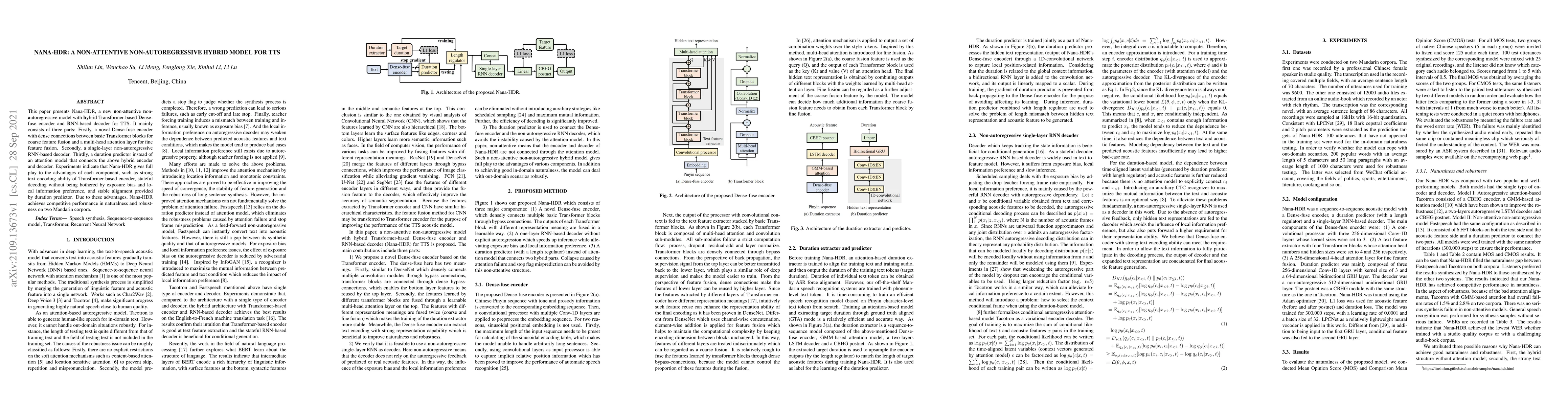 This paper presents Nana-HDR, a new non-attentive non-autoregressive model with hybrid Transformer-based Dense-fuse encoder and RNN-based decoder for TTS. It mainly consists of three parts: Firstly, a novel Dense-fuse encoder with dense connections between basic Transformer blocks for coarse feature fusion and a multi-head attention layer for fine feature fusion. Secondly, a single-layer non-autoregressive RNN-based decoder. Thirdly, a duration predictor instead of an attention model that connects the above hybrid encoder and decoder. Experiments indicate that Nana-HDR gives full play to the advantages of each component, such as strong text encoding ability of Transformer-based encoder, stateful decoding without being bothered by exposure bias and local information preference, and stable alignment provided by duration predictor. Due to these advantages, Nana-HDR achieves competitive performance in naturalness and robustness on two Mandarin corpora.