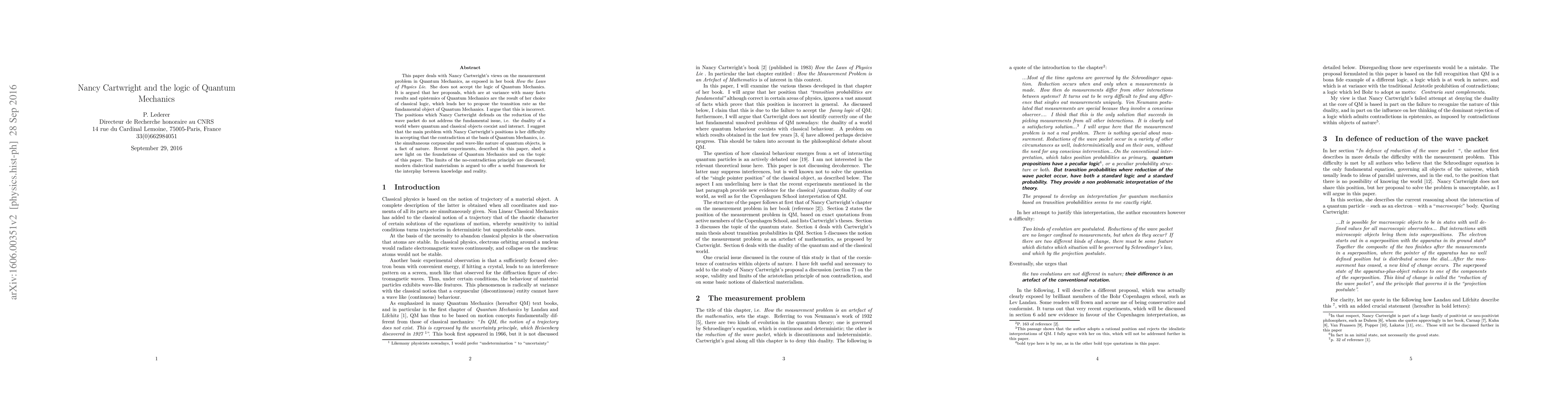 This paper deals with Nancy Cartwright's views on the measurement problem in Quantum Mechanics, as exposed in her book {\it{How the Laws of Physics Lie}}. She does not accept the logic of Quantum Mechanics. It is argued that her proposals, which are at variance with many facts results and epistemics of Quantum Mechanics are the result of her choice of classical logic, which leads her to propose the transition rate as the fundamental object of Quantum Mechanics. I argue that this is incorrect. The positions which Nancy Cartwright defends on the reduction of the wave packet do not address the fundamental issue, i.e. the duality of a world where quantum and classical objects coexist and interact. I suggest that the main problem with Nancy Cartwright's positions is her difficulty in accepting that the contradiction at the basis of Quantum Mechanics, i.e. the simultaneous corpuscular and wave-like nature of quantum objects, is a fact of nature. Recent experiments, described in this paper, shed a new light on the foundations of Quantum Mechanics and on the topic of this paper. The limits of the no-contradiction principle are discussed; modern dialectical materialism is argued to offer a useful framework for the interplay between knowledge and reality.
