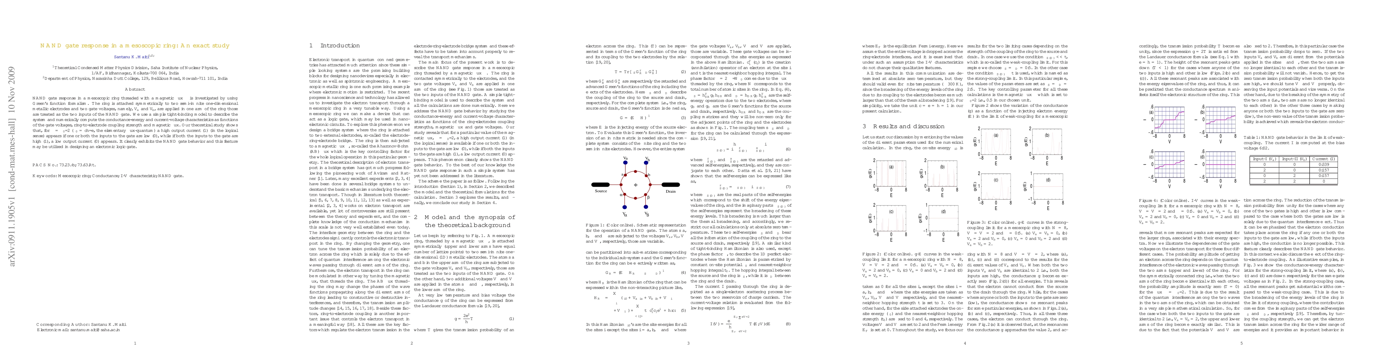 This study investigates the NAND gate response in a mesoscopic ring using Green's function formalism, showing that the ring exhibits NAND logic behavior when threaded with a magnetic flux $\phi=\phi_0/2$, with high output current when one or both inputs are low. This behavior could be useful for designing electronic logic gates.