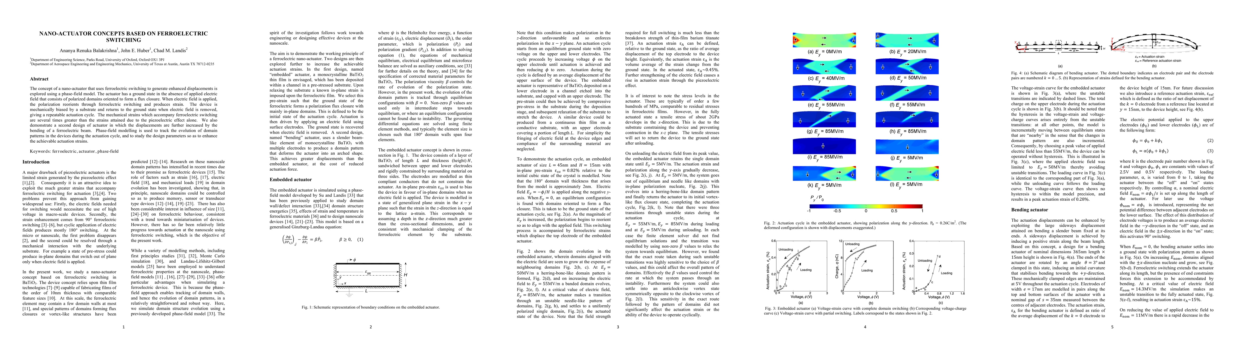 The concept of a nano-actuator that uses ferroelectric switching to generate enhanced displacements is explored using a phase-field model. The actuator has a ground state in the absence of applied electric field that consists of polarized domains oriented to form a flux closure. When electric field is applied, the polarization reorients through ferroelectric switching and produces strain. The device is mechanically biased by a substrate and returns to the ground state when electric field is removed, giving a repeatable actuation cycle. The mechanical strains which accompany ferroelectric switching are several times greater than the strains attained due to the piezoelectric effect alone. We also demonstrate a second design of actuator in which the displacements are further increased by the bending of a ferroelectric beam. Phase-field modelling is used to track the evolution of domain patterns in the devices during the actuation cycle, and to study the design parameters so as to enhance the achievable actuation strains.