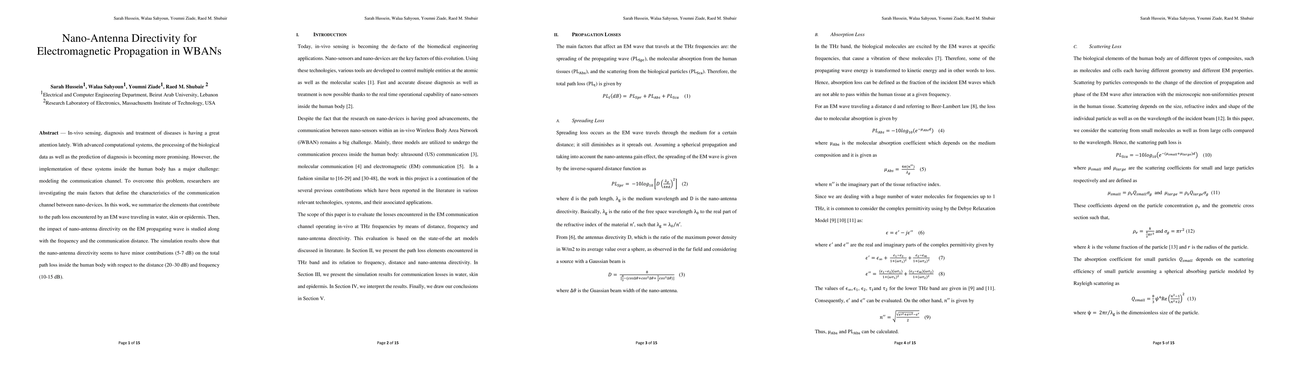 In-vivo sensing, diagnosis and treatment of diseases is having a great attention lately. With advanced computational systems, the processing of the biological data as well as the prediction of diagnosis is becoming more promising. However, the implementation of these systems inside the human body has a major challenge; modeling the communication channel. To overcome this problem, researchers are investigating the main factors that define the characteristics of the communication channel between nano-devices. In this work, we summarize the elements that contribute to the path loss encountered by an EM wave traveling in water, skin or epidermis. Then, the impact of nano-antenna directivity on the EM propagating wave is studied along with the frequency and the communication distance. The simulation results show that the nano-antenna directivity seems to have minor contributions 5 to 7 dB on the total path loss inside the human body with respect to the distance 2 to 30 dB and frequency 10 to 15 dB.