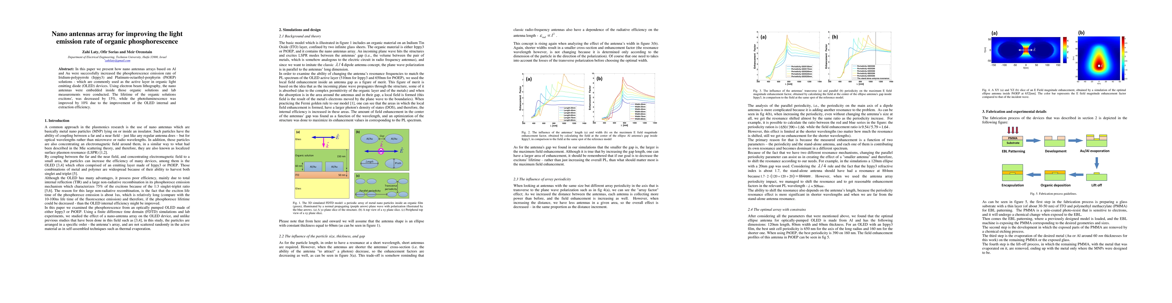 In this paper we present how nano antennas arrays based on Al and Au were successfully increased the phosphorescence emission rate of Iridium-polypyrrole (Irppy3) and Platinum-octaethyl-porphyrin (PtOEP) solutions - which are commonly used as the active layer in organic light emitting diode (OLED) devices. Using electron beam lithography, the nano antennas were embedded inside those organic solutions and lab measurements were conducted. The lifetime of the organic solutions excitons', was decreased by 15%, while the photoluminescence was improved by 10% due to the improvement of the OLED internal and extraction efficiency.