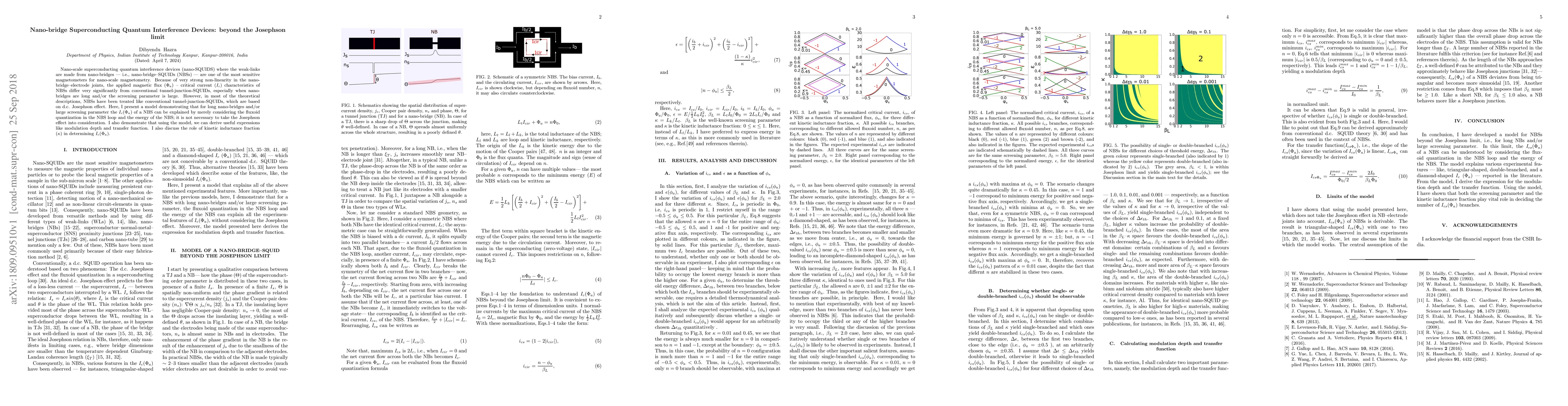 This paper presents a model for nano-bridge-SQUIDs (NBSs), demonstrating that for long nano-bridges and large screening parameters, the critical current-magnetic flux characteristics can be explained by fluxoid quantization and NBS energy, without needing the Josephson effect. The model also provides expressions for modulation depth and transfer function, and discusses the role of kinetic inductance fraction in these characteristics.