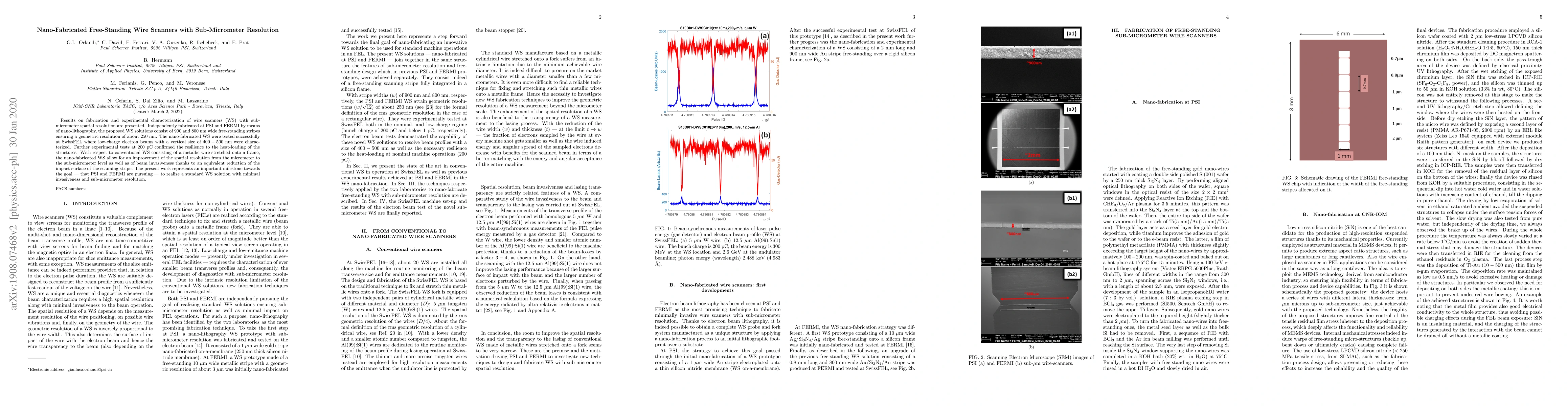 This paper details the development of nano-fabricated free-standing wire-scanners (WS) with sub-micrometer resolution for high-precision diagnostics in particle accelerators, specifically in Free-Electron-Lasers (FEL). The new WS design, achieved via nano-lithography, offers improved spatial resolution and minimal invasiveness, successfully tested at SwissFEL.