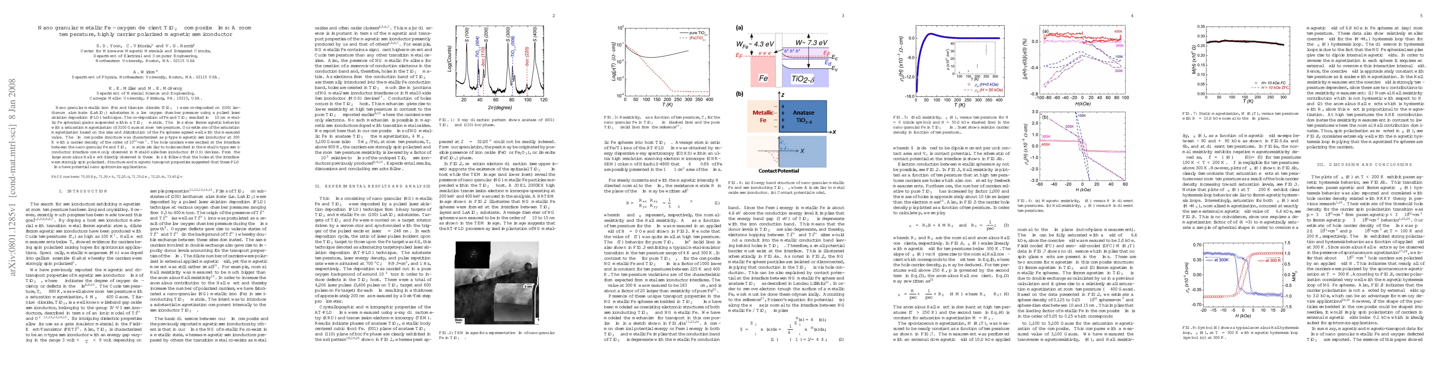 Nano granular metallic iron (Fe) and titanium dioxide (TiO$_{2-\delta}$) were co-deposited on (100) lanthanum aluminate (LaAlO$_3$) substrates in a low oxygen chamber pressure using a pulsed laser ablation deposition (PLD) technique. The co-deposition of Fe and TiO$_2$ resulted in $\approx$ 10 nm metallic Fe spherical grains suspended within a TiO$_{2-\delta}$ matrix. The films show ferromagnetic behavior with a saturation magnetization of 3100 Gauss at room temperature. Our estimate of the saturation magnetization based on the size and distribution of the Fe spheres agreed well with the measured value. The film composite structure was characterized as p-type magnetic semiconductor at 300 K with a carrier density of the order of $ 10^{22} /{\rm cm^3}$. The hole carriers were excited at the interface between the nano granular Fe and TiO$_{2-\delta}$ matrix similar to holes excited in the metal/n-type semiconductor interface commonly observed in Metal-Oxide-Semiconductor (MOS) devices. From the large anomalous Hall effect directly observed in these films it follows that the holes at the interface were strongly spin polarized. Structure and magneto transport properties suggested that these PLD films have potential nano spintronics applications.