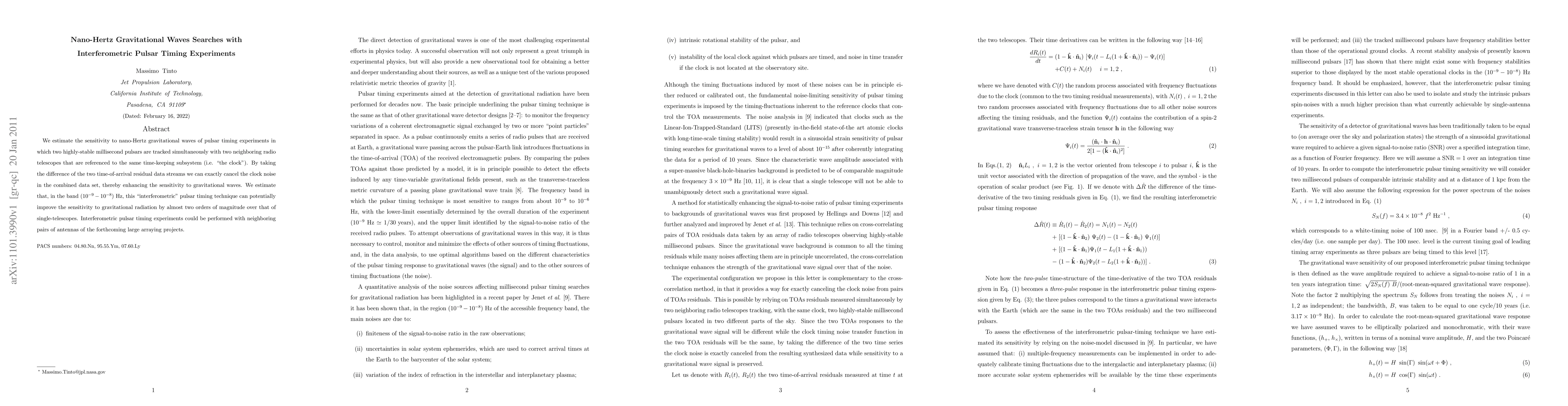 This paper explores the potential of interferometric pulsar timing experiments to detect nano-Hertz gravitational waves, estimating a significant improvement in sensitivity by nearly two orders of magnitude over single-telescope methods. The technique leverages the difference between two highly-stable millisecond pulsars tracked by neighboring radio telescopes to cancel clock noise.