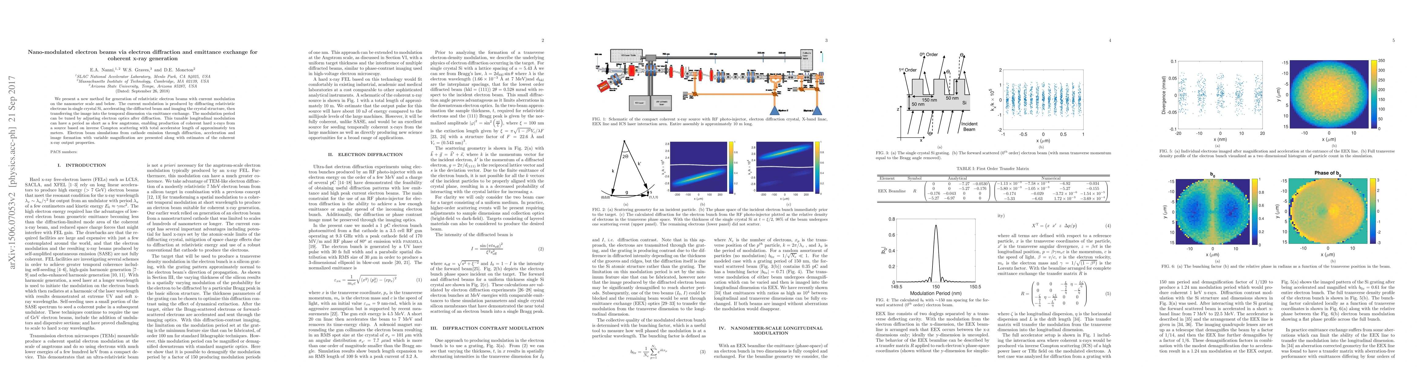We present a new method for generation of relativistic electron beams with current modulation on the nanometer scale and below. The current modulation is produced by diffracting relativistic electrons in single crystal Si, accelerating the diffracted beam and imaging the crystal structure, then transferring the image into the temporal dimension via emittance exchange. The modulation period can be tuned by adjusting electron optics after diffraction. This tunable longitudinal modulation can have a period as short as a few angstroms, enabling production of coherent hard x-rays from a source based on inverse Compton scattering with total accelerator length of approximately ten meters. Electron beam simulations from cathode emission through diffraction, acceleration and image formation with variable magnification are presented along with estimates of the coherent x-ray output properties.