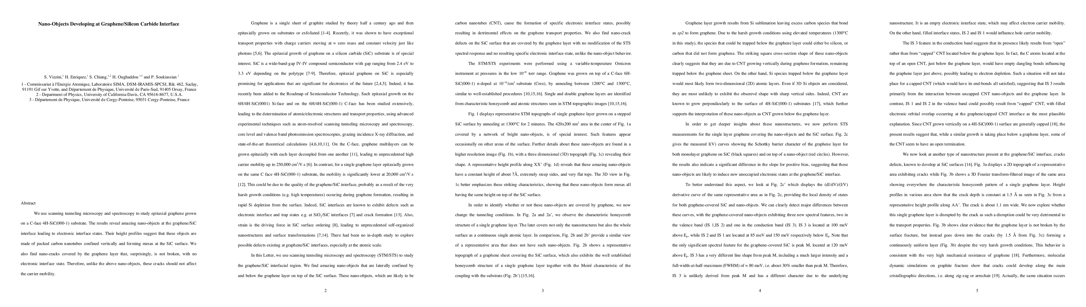 This study uses scanning tunneling microscopy to investigate epitaxial graphene on a 4H-SiC substrate, revealing nano-objects composed of packed carbon nanotubes that create electronic interface states. Additionally, it finds nano-cracks beneath the graphene layer that do not break it and do not affect carrier mobility.