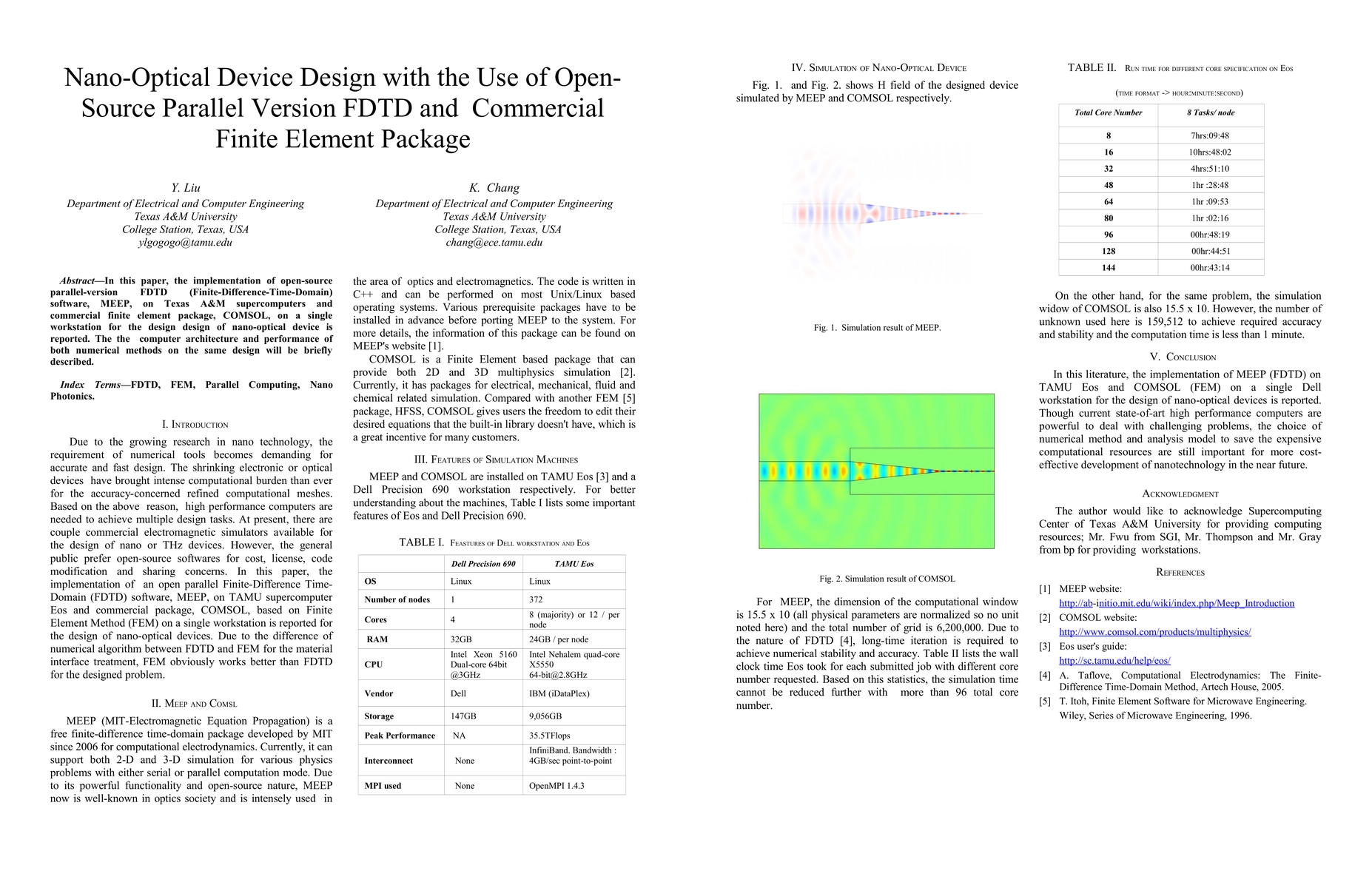 In this paper, the implementation of open-source parallel-version FDTD (Finite-Difference-Time-Domain) software, MEEP, on Texas A&M supercomputers and commercial finite element package, COMSOL, on a single workstation for the design design of nano-optical device is reported. The the computer architecture and performance of both numerical methods on the same design will be briefly described.