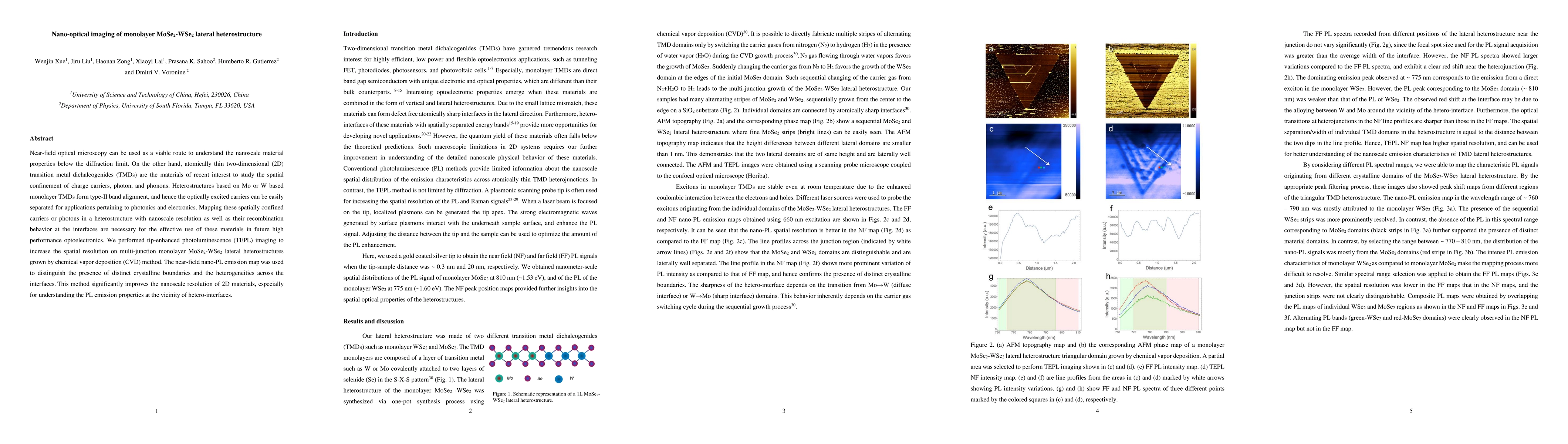 Near-field optical microscopy can be used as a viable route to understand the nanoscale material properties below the diffraction limit. On the other hand, atomically thin two-dimensional (2D) transition metal dichalcogenides (TMDs) are the materials of recent interest to study the spatial confinement of charge carriers, photon, and phonons. Heterostructures based on Mo or W based monolayer TMDs form type-II band alignment, and hence the optically excited carriers can be easily separated for applications pertaining to photonics and electronics. Mapping these spatially confined carriers or photons in a heterostructure with nanoscale resolution as well as their recombination behavior at the interfaces are necessary for the effective use of these materials in future high performance optoelectronics. We performed tip-enhanced photoluminescence (TEPL) imaging to increase the spatial resolution on multi-junction monolayer MoSe2-WSe2 lateral heterostructures grown by chemical vapor deposition (CVD) method. The near-field nano-PL emission map was used to distinguish the presence of distinct crystalline boundaries and the heterogeneities across the interfaces. This method significantly improves the nanoscale resolution of 2D materials, especially for understanding the PL emission properties at the vicinity of hetero-interfaces.