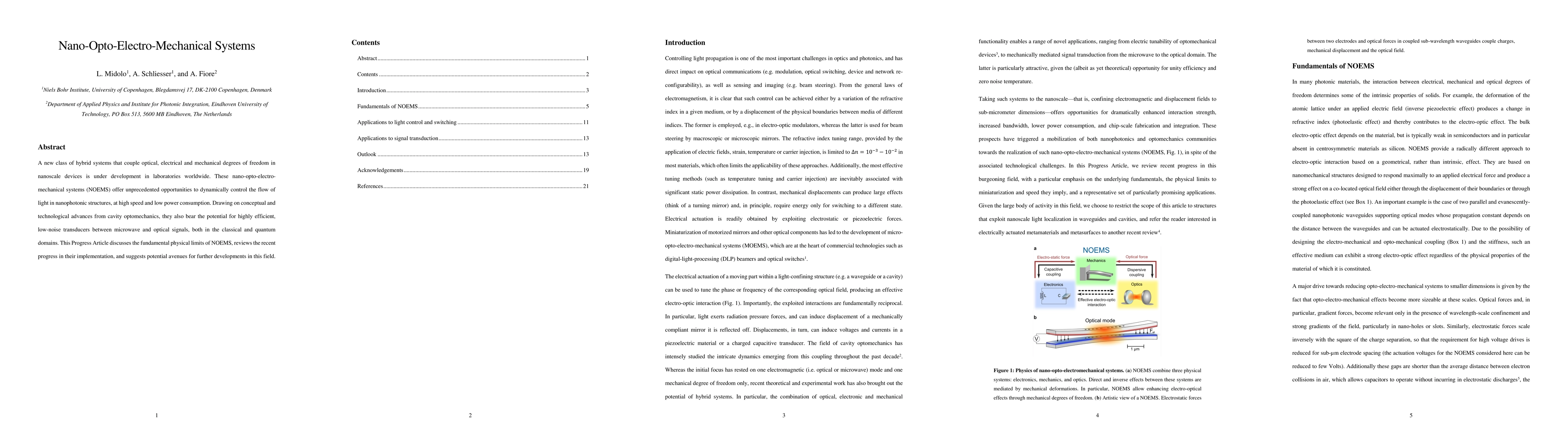 This paper reviews nano-opto-electro-mechanical systems (NOEMS), which integrate optical, electrical, and mechanical components at the nanoscale. These systems enable dynamic control of light flow and promise efficient, low-power signal transduction between microwave and optical domains, highlighting both their current progress and future potential.